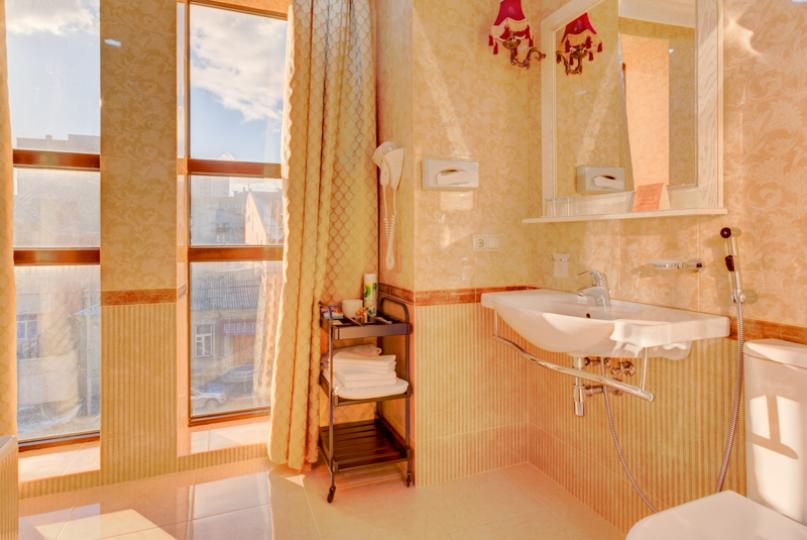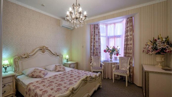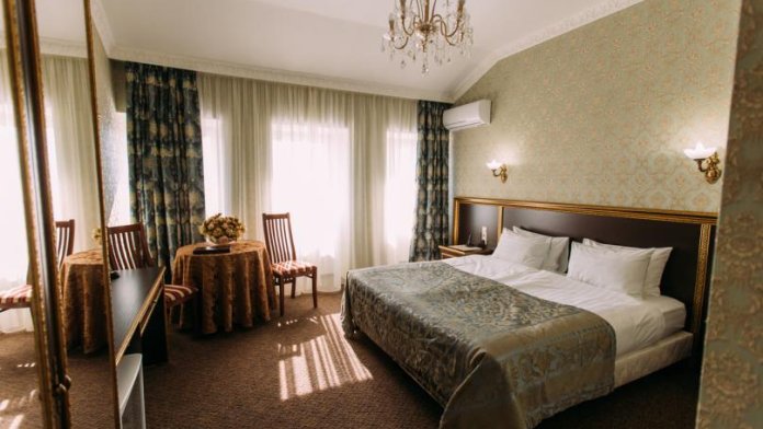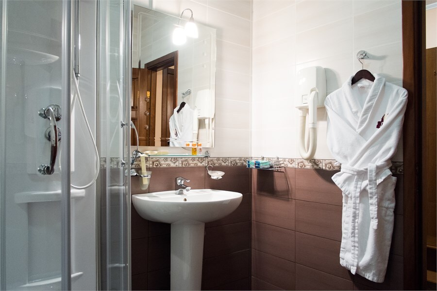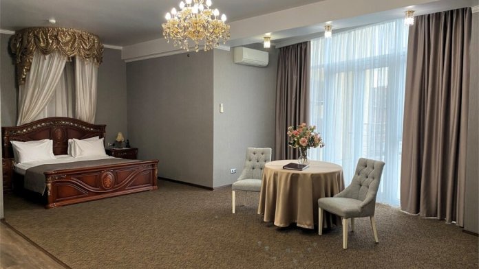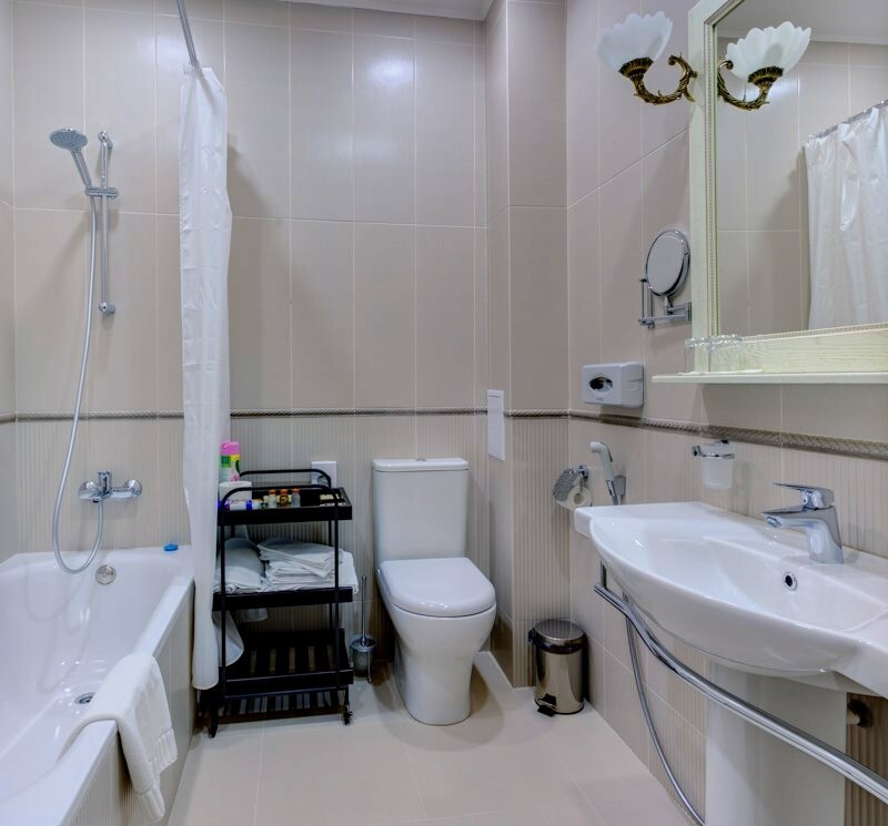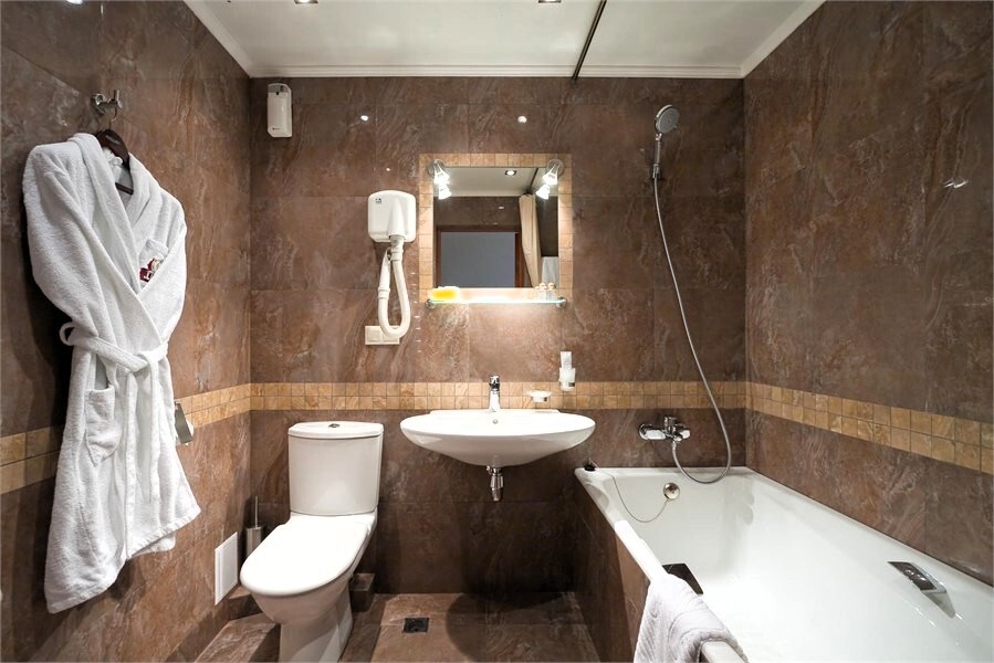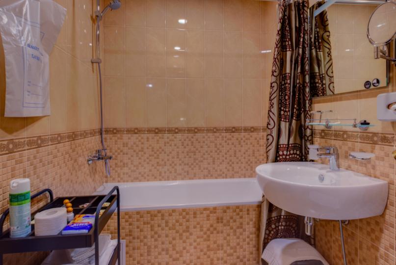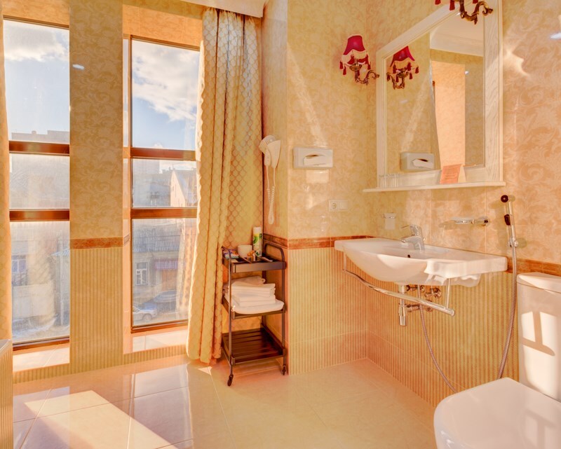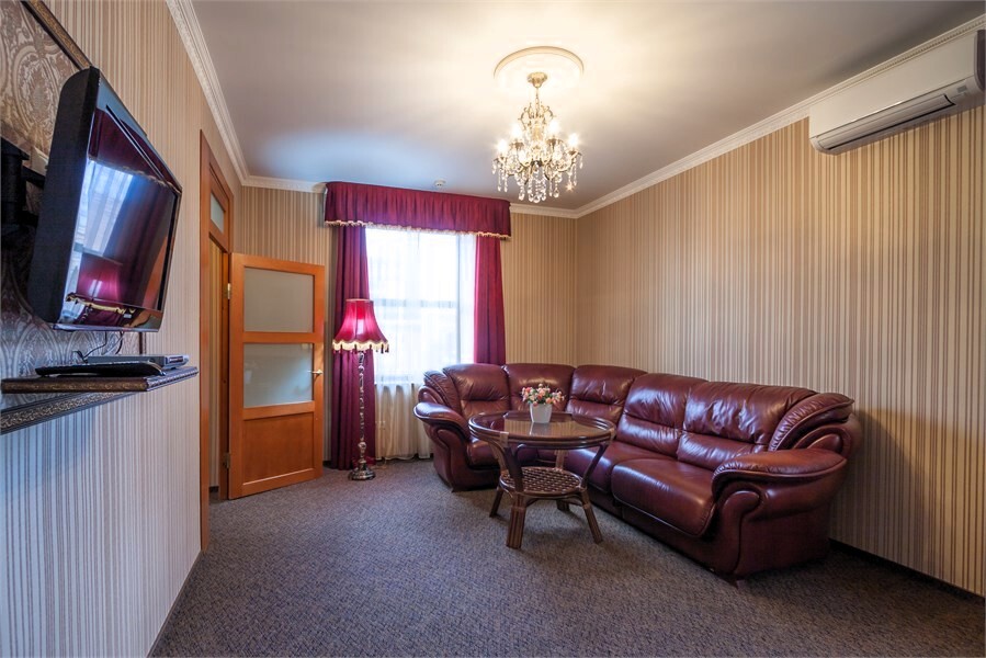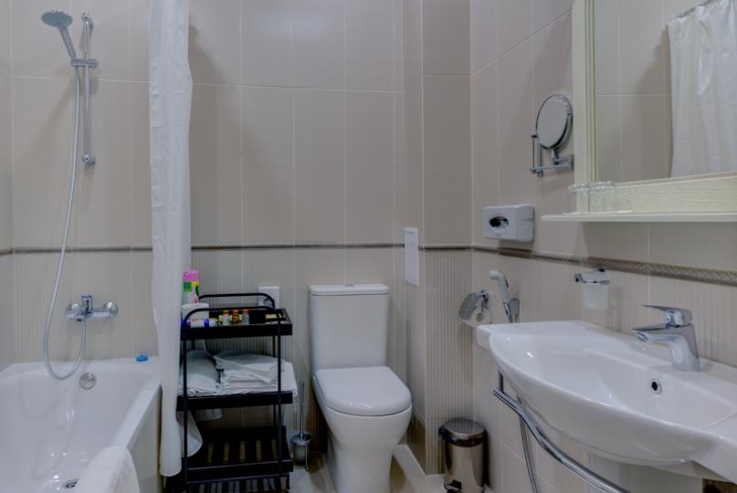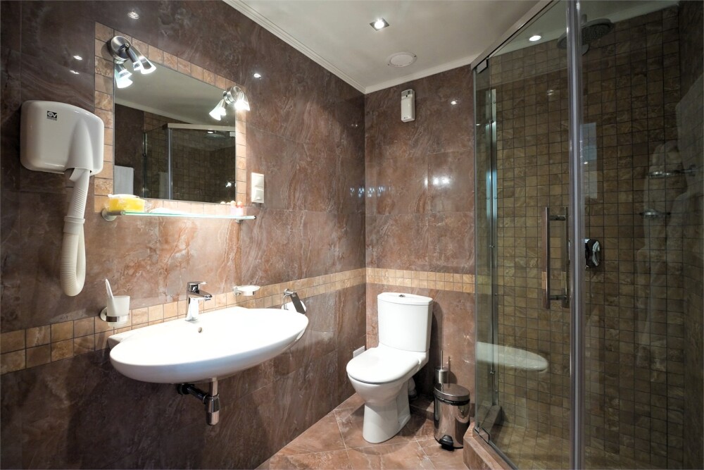 Изысканный просторный однокомнатный номер с классической мебелью, двуспальной кроватью идеально подходит для комфортабельного пребывания в гостинице. В ванной комнате предусмотрена душевая кабина.