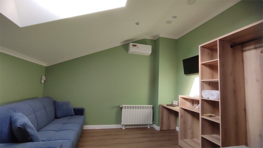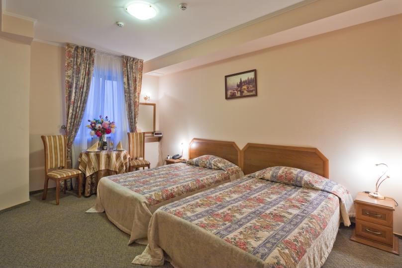 Стандартный однокомнатный номер или двухкомнатный мансардный номер, классическая мебель, двуспальная кровать или 2 односпальные кровати, сплит-система, душевая кабина или ванна.