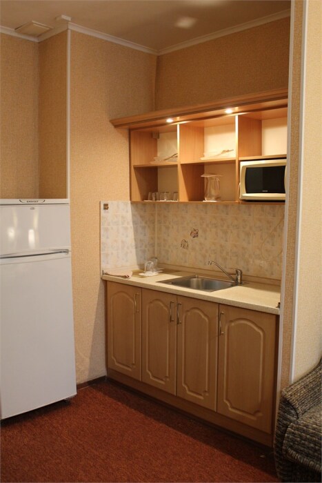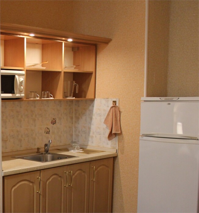 Ж/К телевизор, мини-кухня, микроволновая печь, холодильник, чайник, набор посуды, халаты. Своя отдельная ванная комната и туалет.