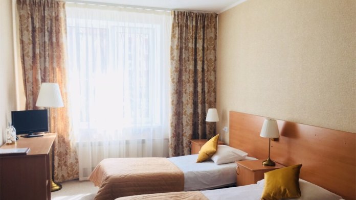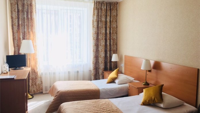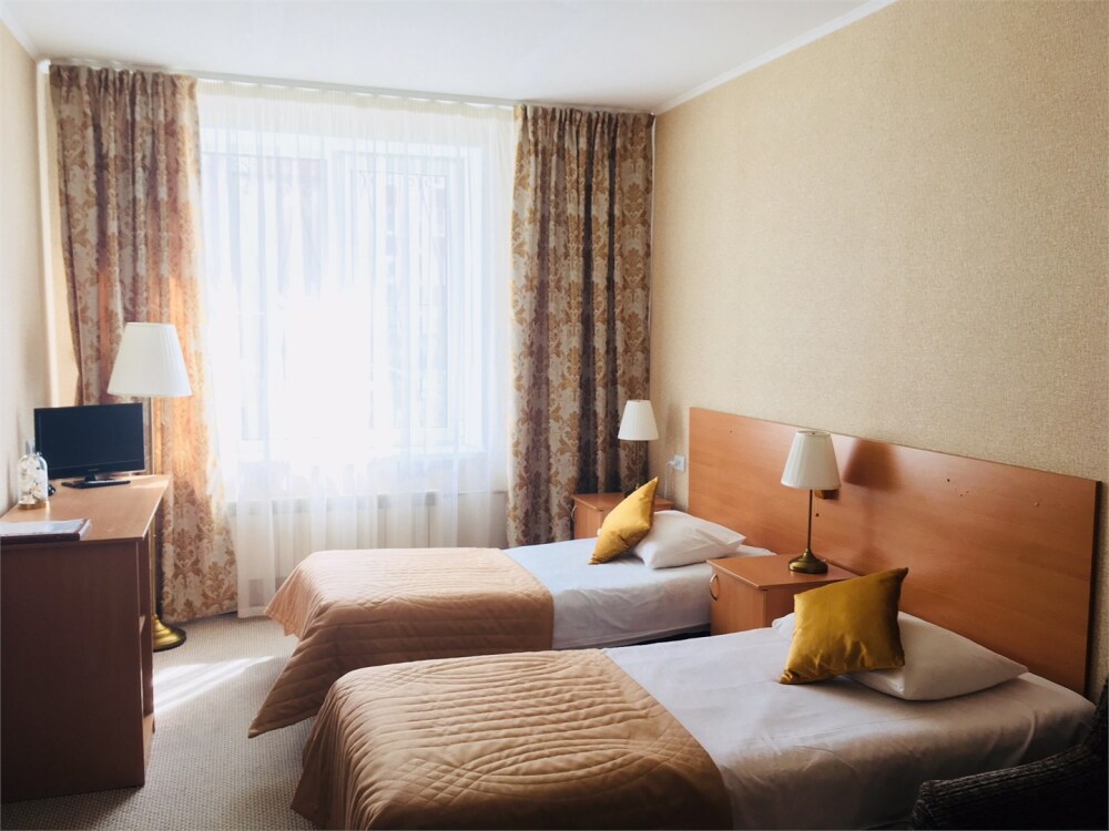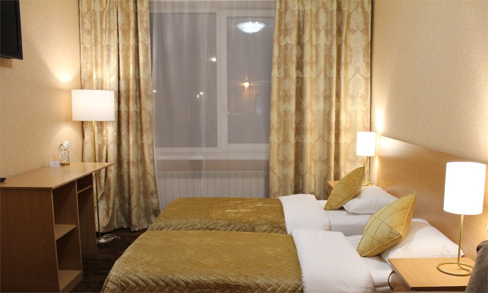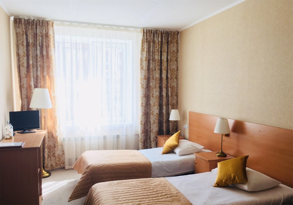Две односпальные кровати, ж/к телевизор, занавески blackout, чайник, чашки, стаканы для воды. В комнате своя отдельная ванная комната и туалет.