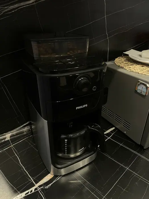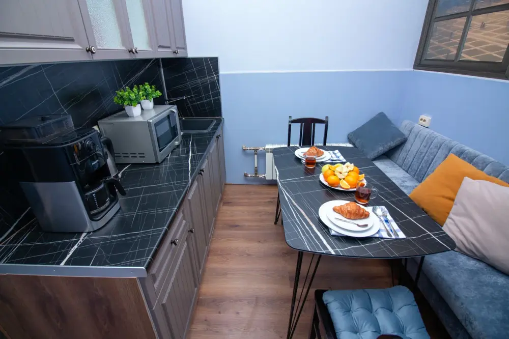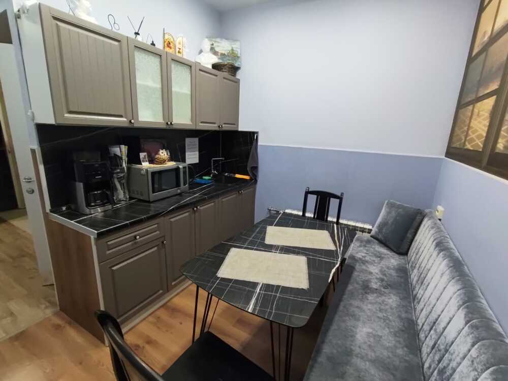 Зона кухни оснащена: свч печью, холодильником, чайником и всей необходимой посудой и столовыми приборами. В Вашем распоряжении всегда кофемашина, а также чай и сладости.