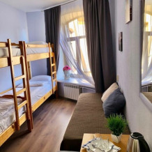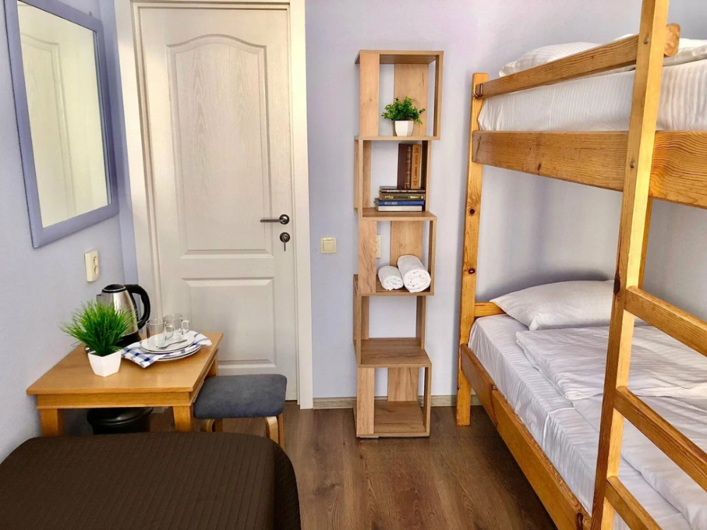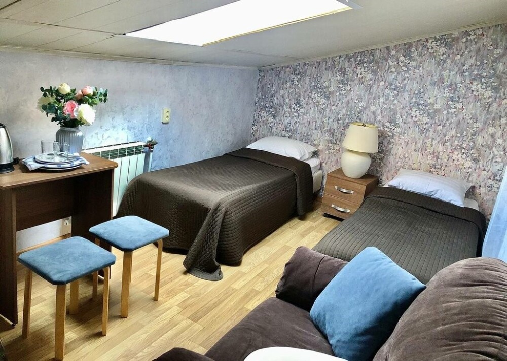 Удобства на этаже. Ортопедические матрасы и шторы блекаут позволят Вам отлично отдохнуть и выспаться. В номере есть чайная зона, двуспальная кровать и двуспальный диван, шкаф. Каждому гостю предоставляются бесплатные полотенца.