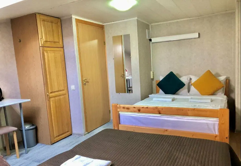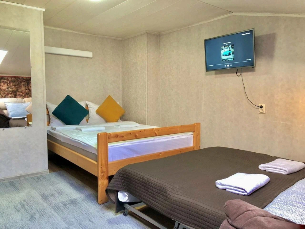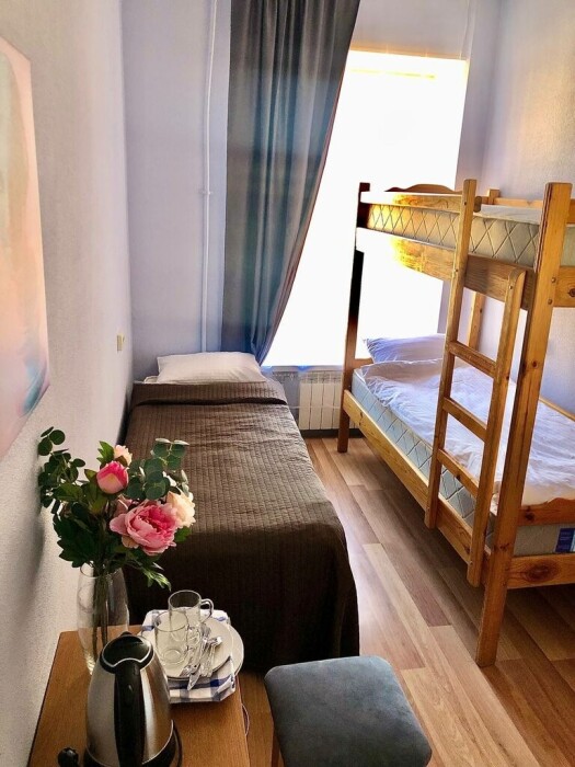 В комнатах есть шторы блэкаут, которые не пропускают свет, и в период белых ночей наши гости также могут максимально отдохнуть в ночное время. Спальные места укомплектованы качественными ортопедическими матрасами, что позволит восстановиться во время сна.
