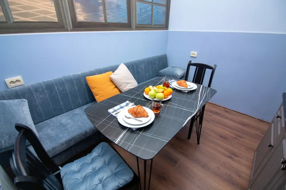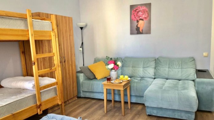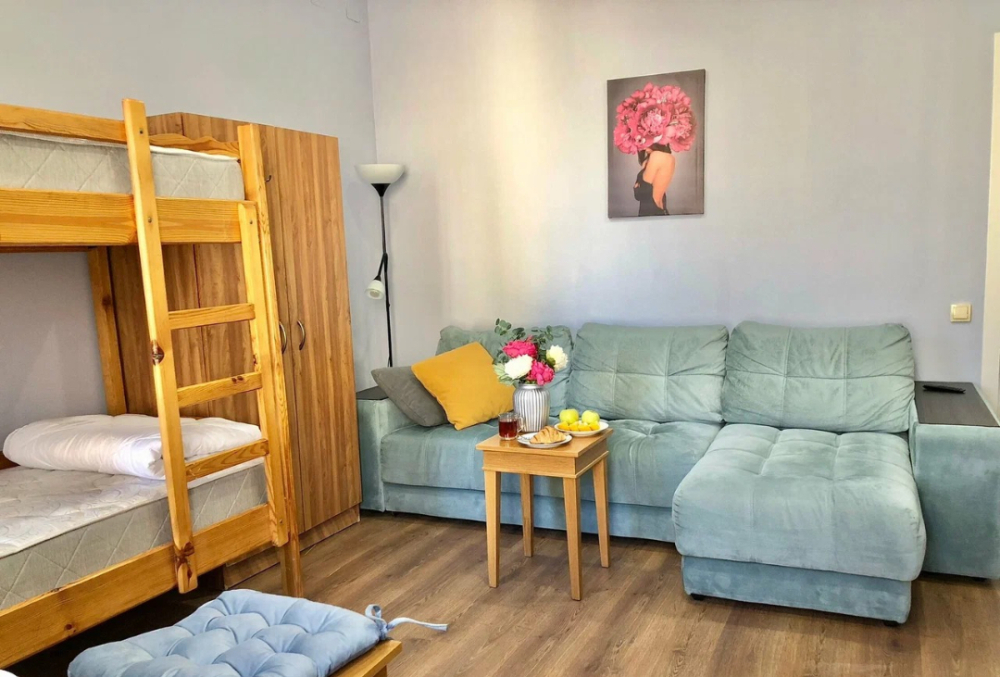 Ортопедические матрасы и шторы блэкаут позволят Вам отлично отдохнуть и выспаться. В номере есть чайная зона, большой раскладной диван, смарт телевизор и шкаф. Каждому гостю предоставляются бесплатные полотенца. Удобства на этаже.