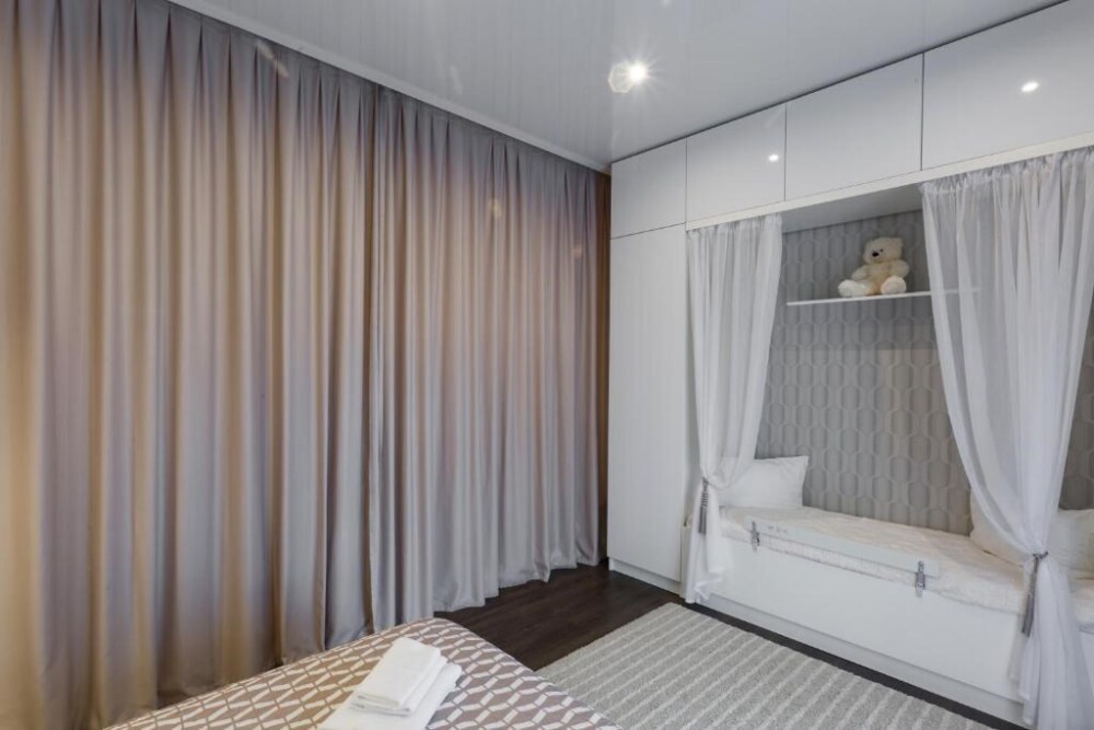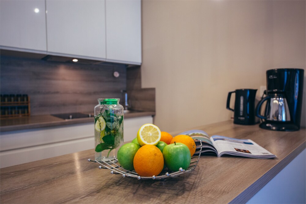 В апартаментах выполнены ремонты по индивидуальным дизайн-проектам, кухня оборудована встроенным холодильником, духовым шкафом, электрической варочной панелью, микроволновой печью, чайником и кофеваркой, укомплектована посудой и столовыми приборами. Номера оснащены кондиционером и приточной вентиляцией. Телевизор с функцией smart подключен к интернету. Апартаменты включают стиральную машину, набор для моющих средств в душевых комнатах, утюг, гладильную доску и прочие приспособления для комфортного проживания. Детская кровать имеет боковую поддержку, а на полке Ваших детей ждут игрушки. Проснувшись утром Вы выйдете на балкон и сможете любоваться прекрасным Балтийским морем.