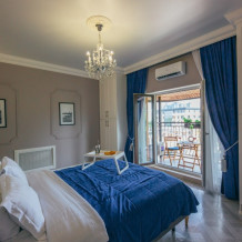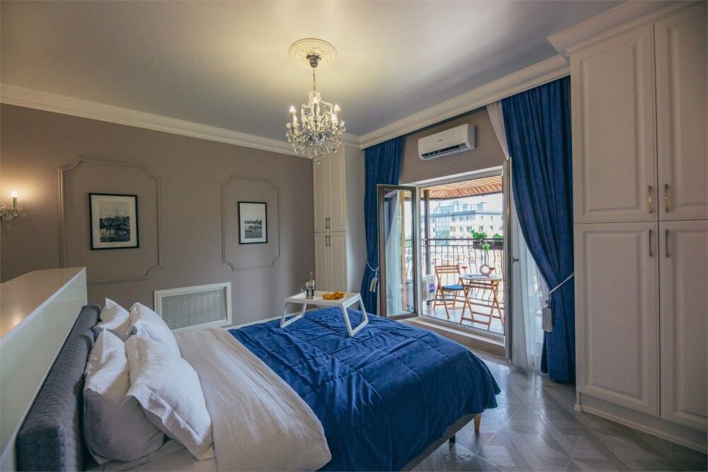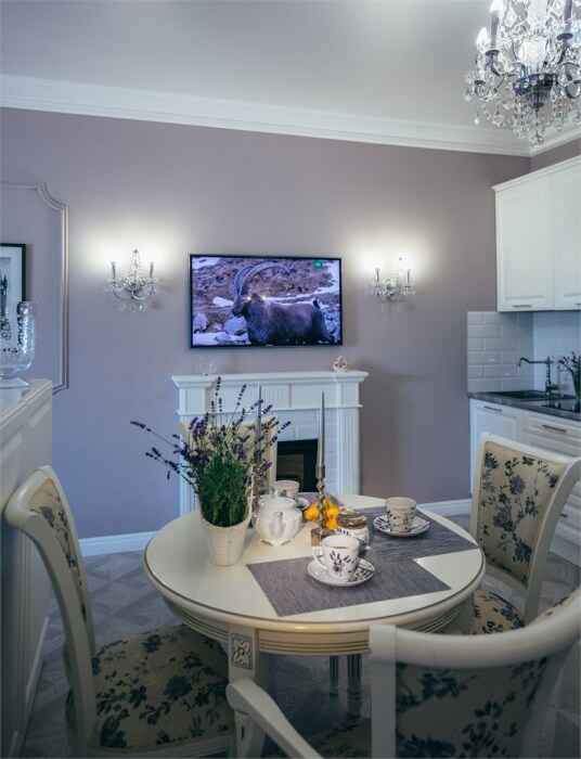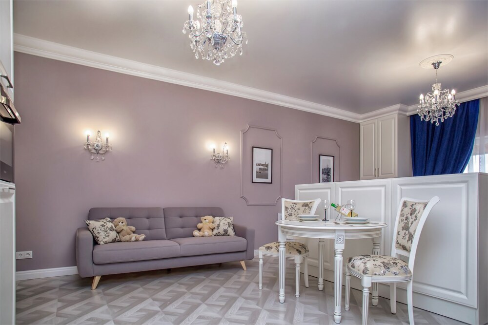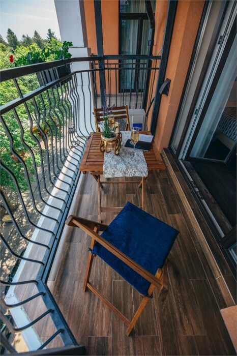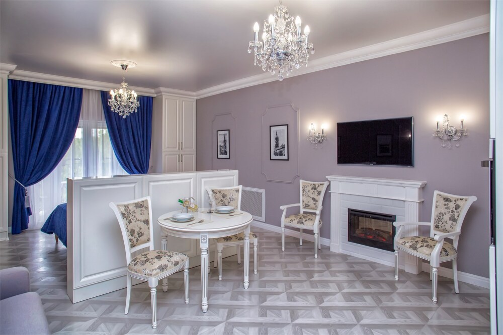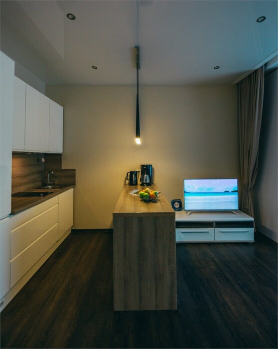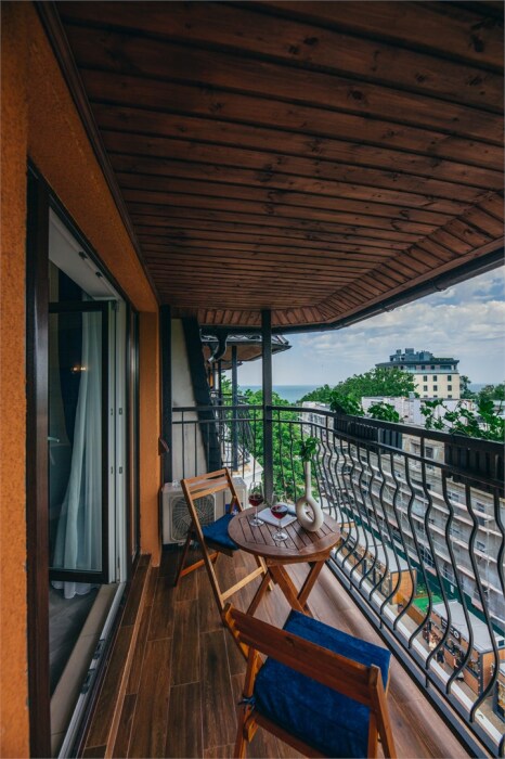 Апартаменты-студия с балконом и видом на море, классический стиль романтик, с дизайнерской мебелью и электрокамином. Большой балкон и панорамные окна. Номер оборудован всем необходимым для отдыха и проживания, анатомический матрас Ascona Sleep Style, система кондиционирования воздуха и приточная вентиляция, а так же кухня со встроенной техникой и посудой.