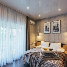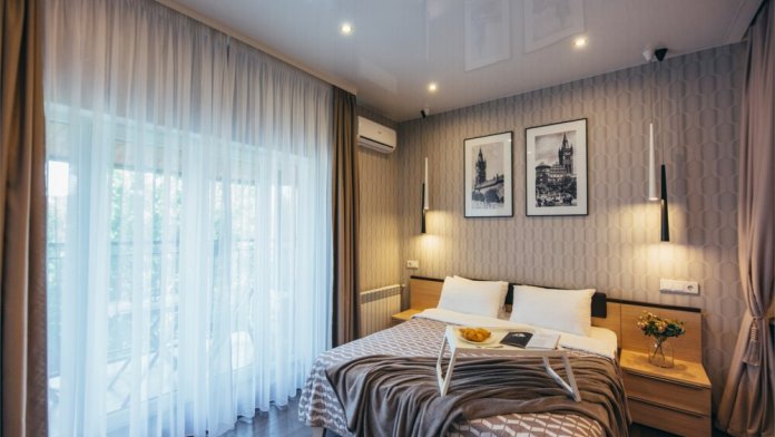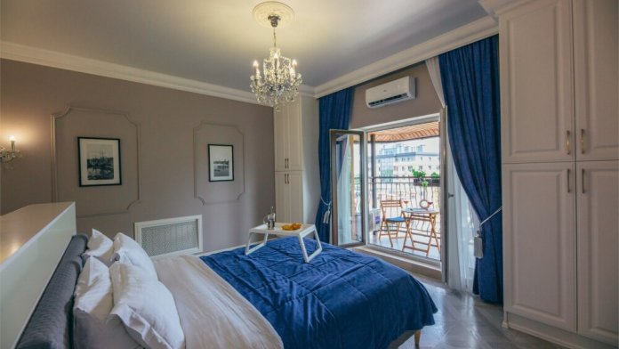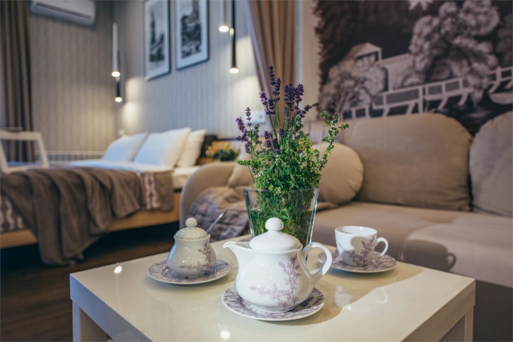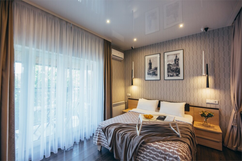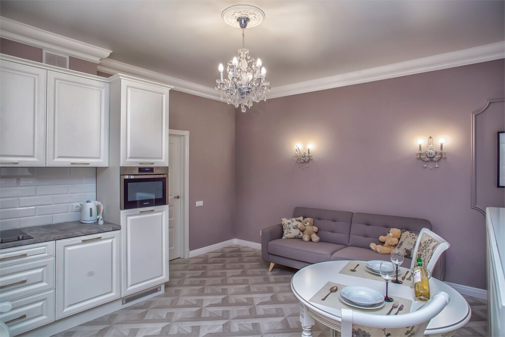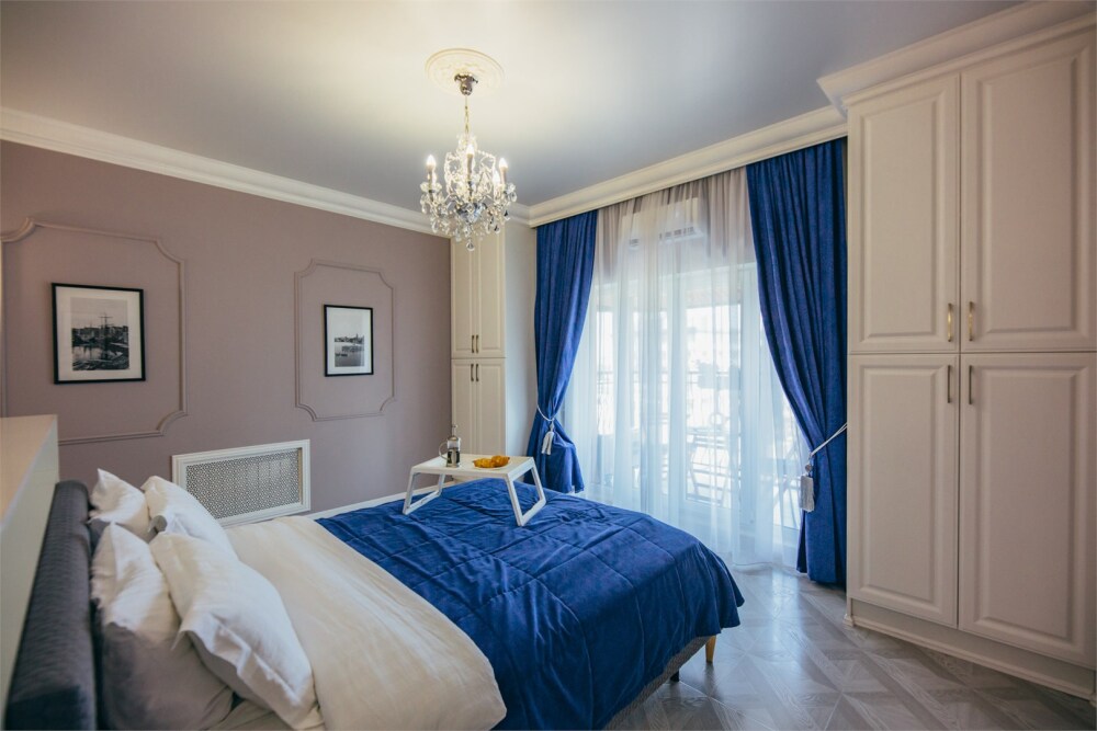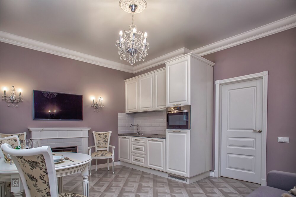 Апартаменты-студия с балконом и видом на море, классический стиль романтик, с дизайнерской мебелью и электрокамином. Большой балкон и панорамные окна. Номер оборудован всем необходимым для отдыха и проживания, анатомический матрас Ascona Sleep Style, система кондиционирования воздуха и приточная вентиляция, а так же кухня со встроенной техникой и посудой.
