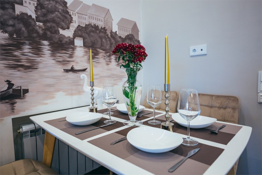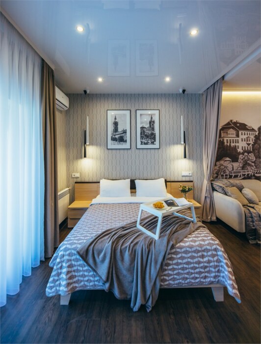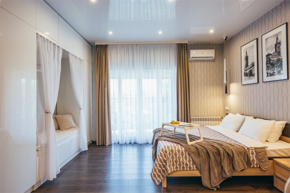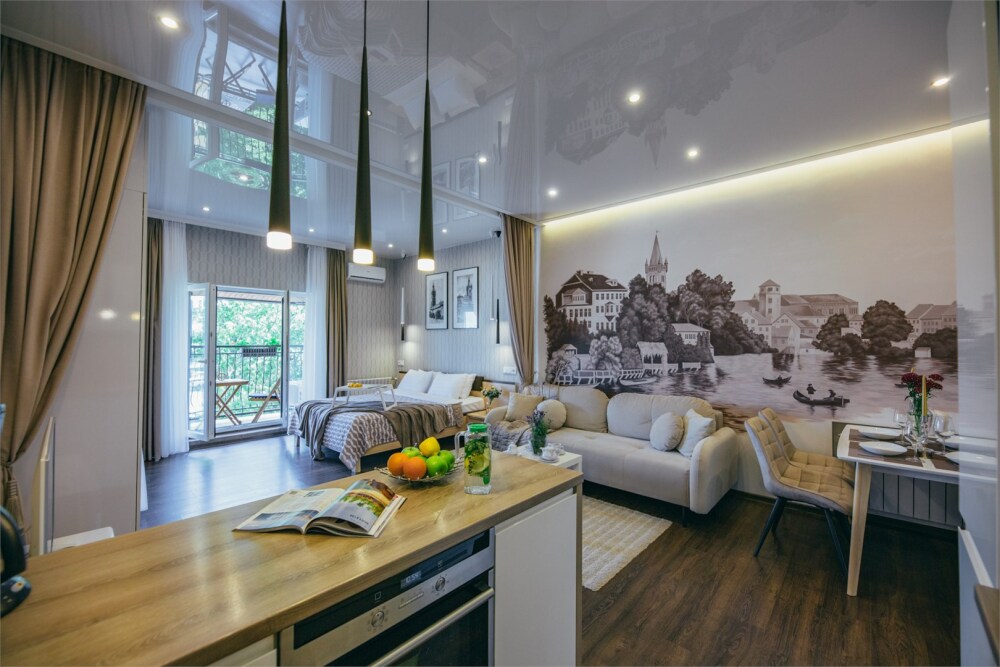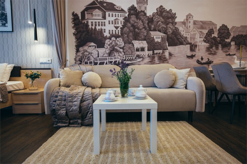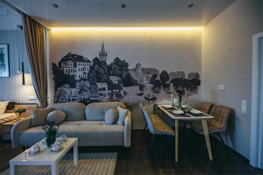 Апартаменты-студия с балконом и видом на море, семейный номер со встроенной детской кроваткой. Большой балкон и панорамные окна. Картина ручной работы на стене в стиле «Старый Кенигсберг». Номер оборудован всем необходимым для отдыха и проживания, анатомический матрас Ascona Profi Comfort, система кондиционирования воздуха и приточная вентиляция, а так же кухня со встроенной техникой и посудой.