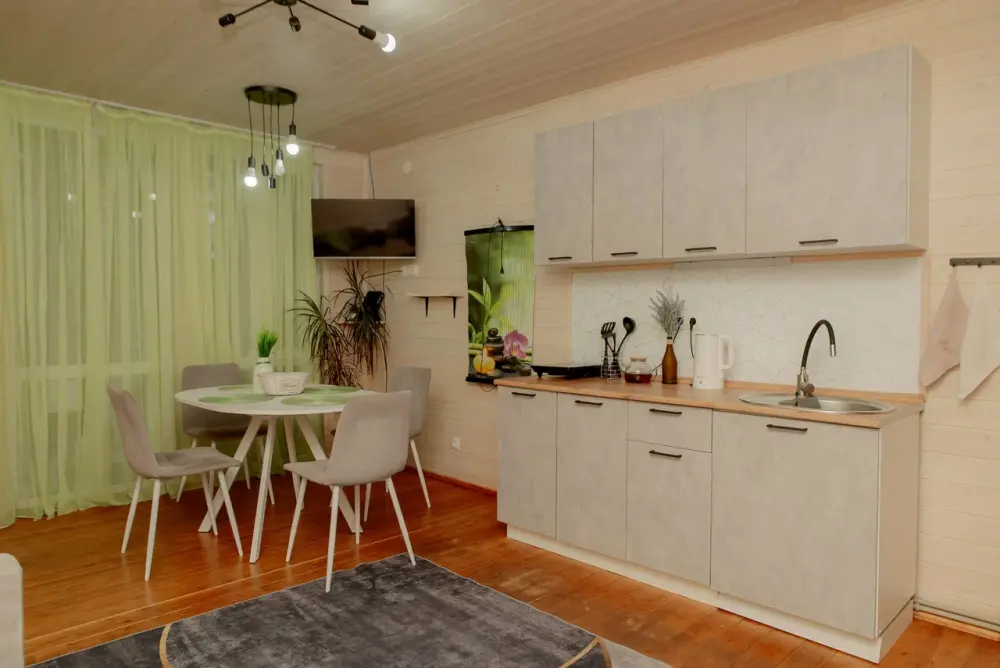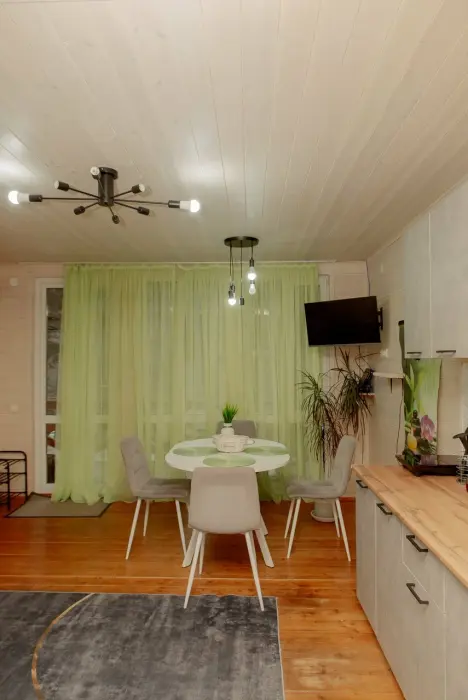 Внутри дом оборудован всем необходимым для комфортного проживания. Просторная гостиная совмещена со столовой, обеспечивая удобство для проведения семейных обедов и дружеских посиделок. Кухня оснащена современной техникой и набором посуды для приготовления любимых блюд, а наличие мангала добавляет уют и тепло в прохладные вечера.