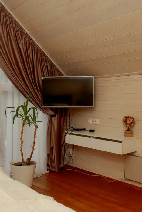 Снаружи дом выполнен из натуральных экологических материалов, что придает ему особый шарм и гармонию с окружающим ландшафтом. Терраса с видом на горы позволяет наслаждаться потрясающими закатами и рассветами, а также проводить уютные вечера в кругу близких и друзей.