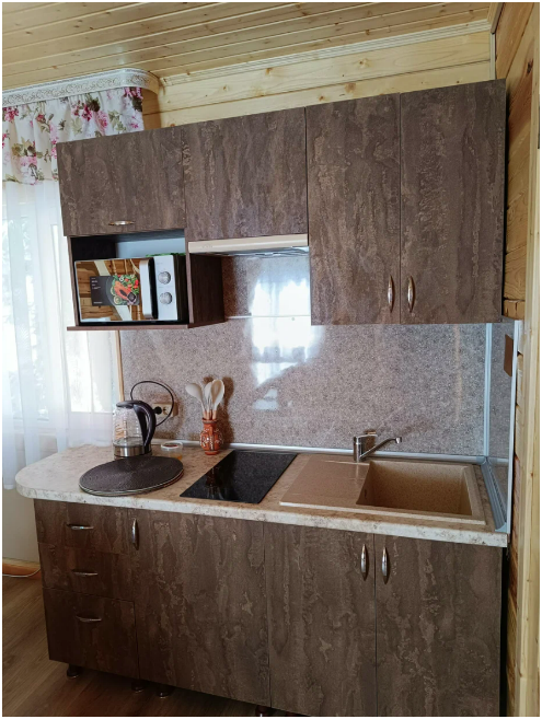 Кухня с индукционной плитой, посудой для приготовления и сервировки стола, чайником, холодильником, микроволновкой.