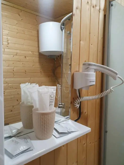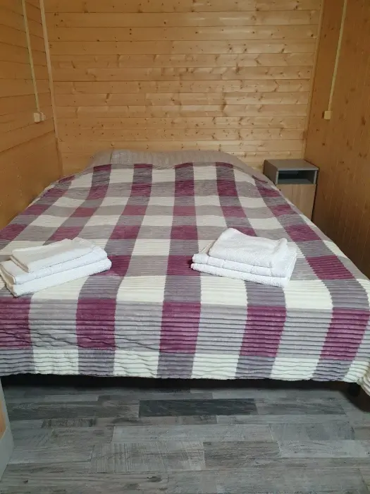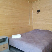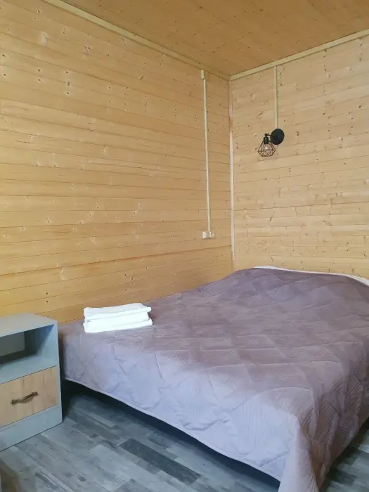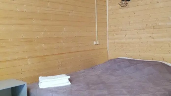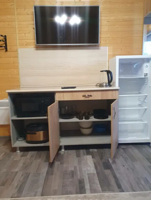 В домиках есть всё необходимое: большая кровать, диван, кухонный гарнитур и бытовая техника (микроволновая печь, мультиварка, чайник), а также посуда, фен, шампунь, полотенце и гель для душа.
