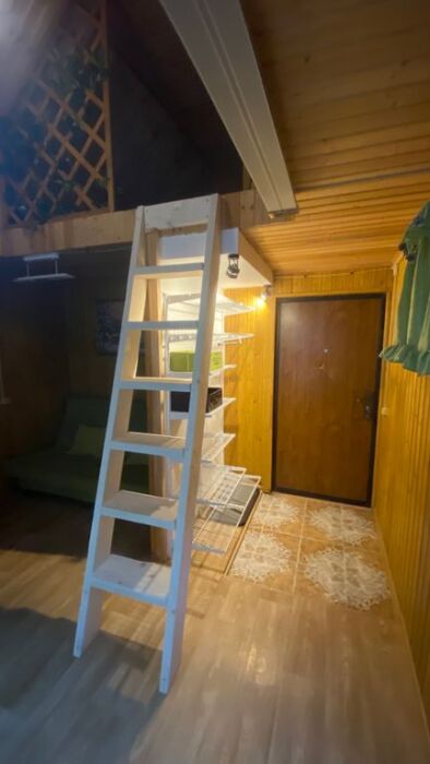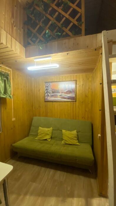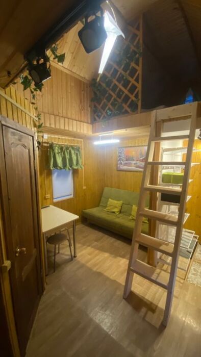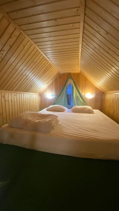 Один домик может принять 4 человека, в нем двуспальная кровать на втором этаже и внизу раскладной диван.