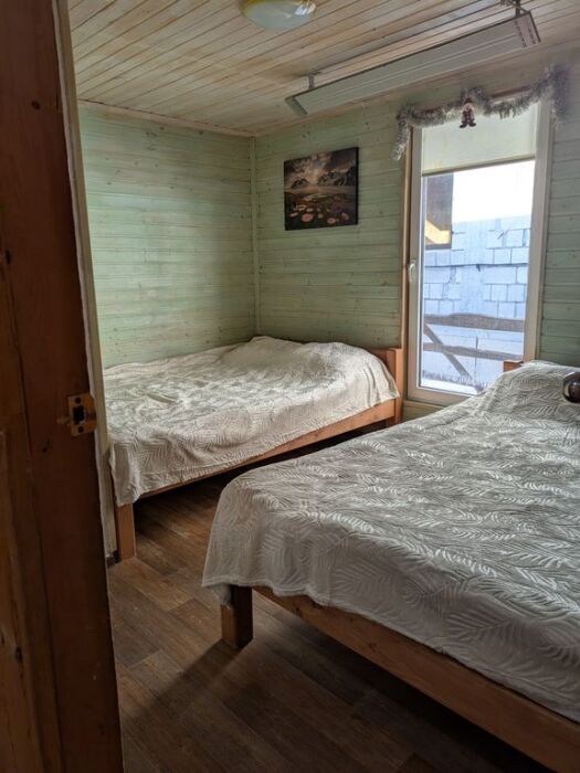 Второй домик вмещает 8 человек, в нем расположены 2 комнаты, в каждой из которых по две двуспальные кровати.