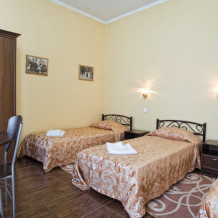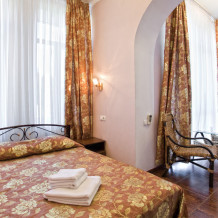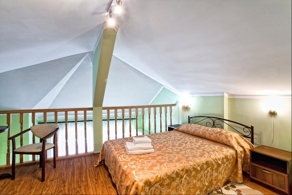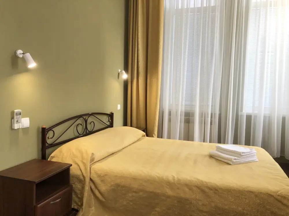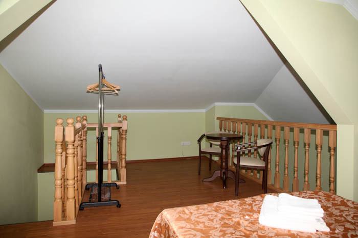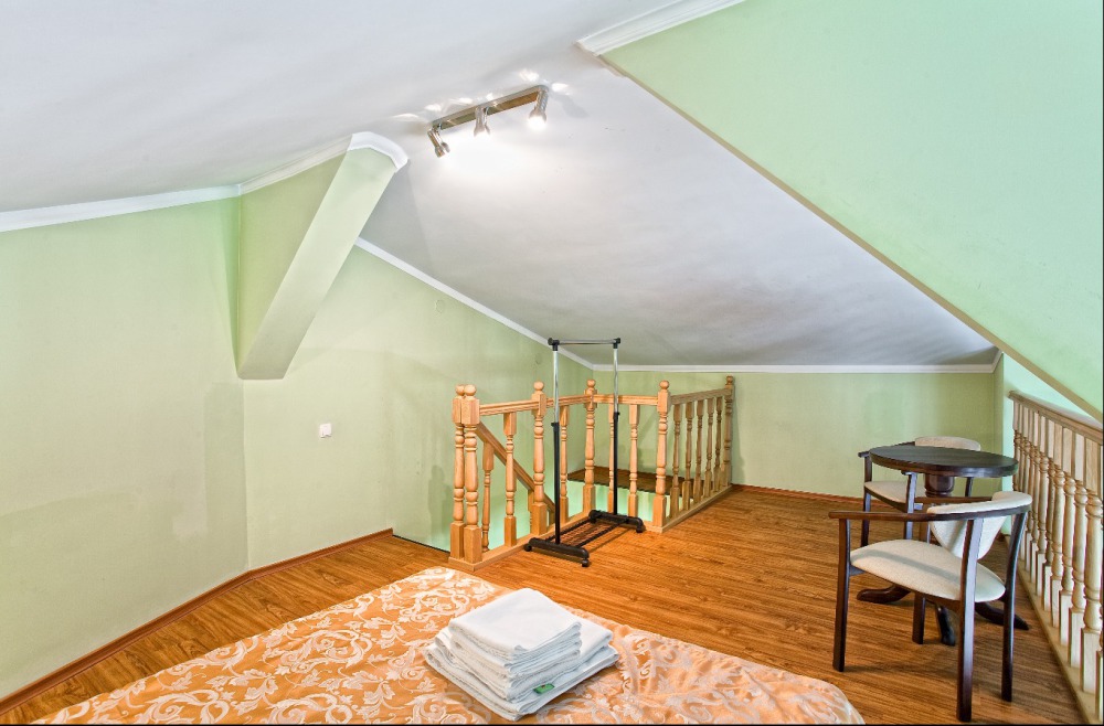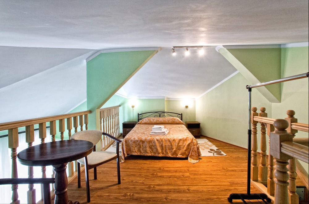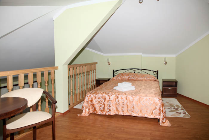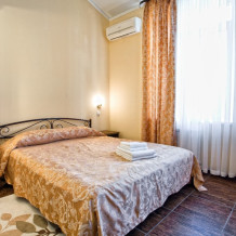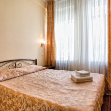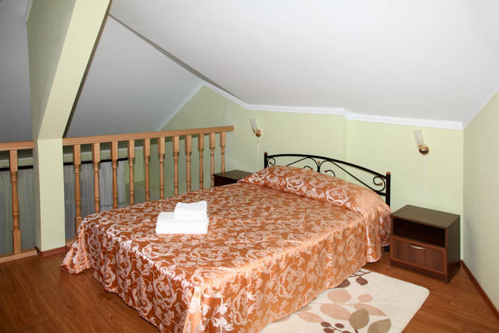 Кровати: 1 двуспальная кровать, раскладной диван. Возможно доп.место. Номер расчитан на проживание 4-ых гостей