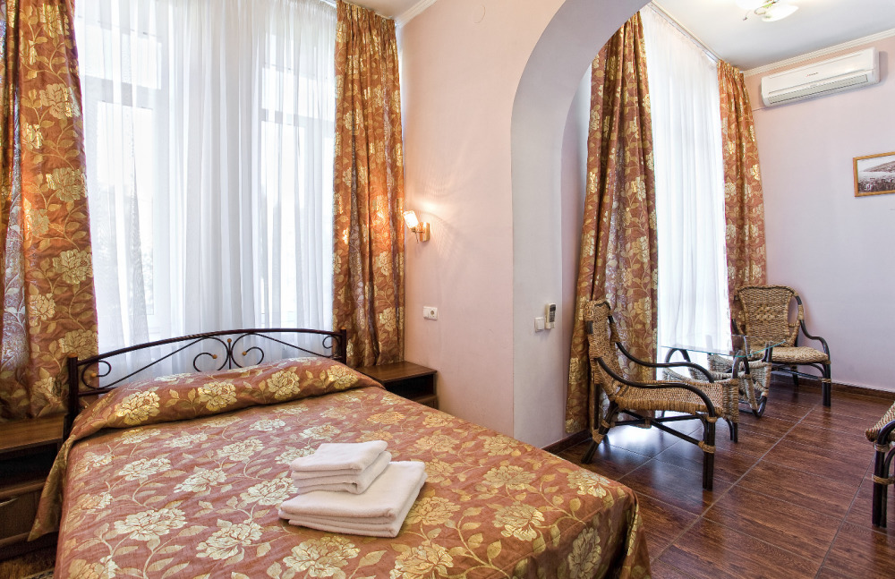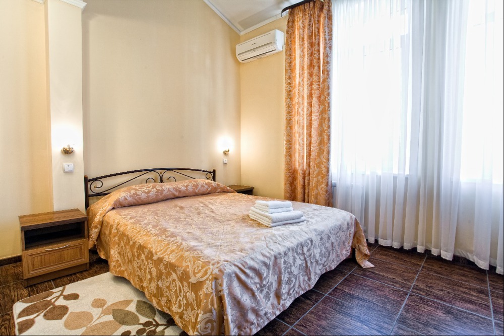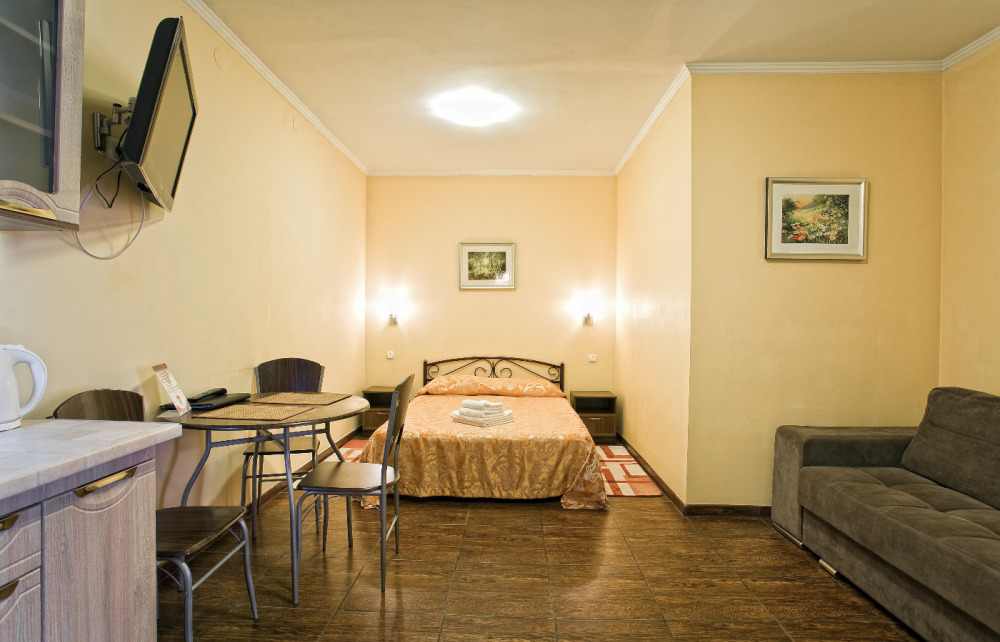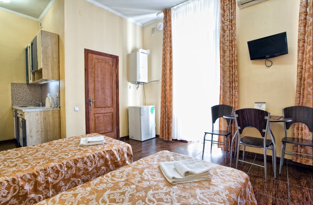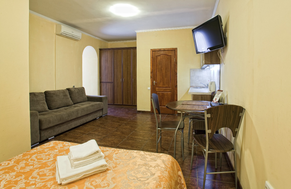 Гости могут разместиться в номерах разных категорий: Стандарт, Стандарт улучшенный, Полулюкс и Люкс. Каждый номер оборудован кондиционером, Wi-Fi, отоплением, TV, полностью оборудованной кухней, санузлом, белоснежным постельным бельем и полотенцами.