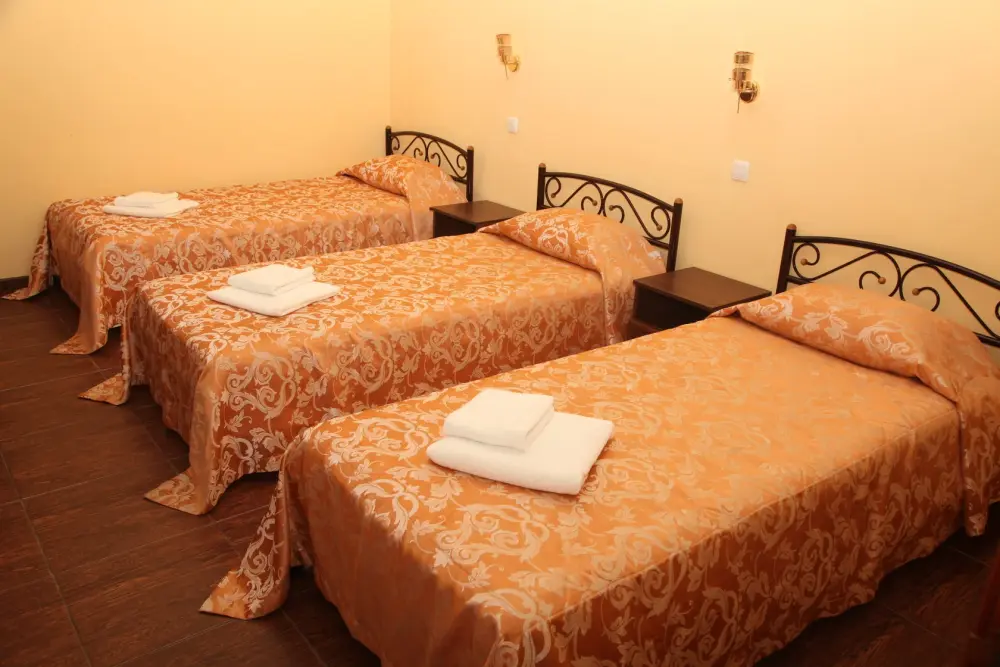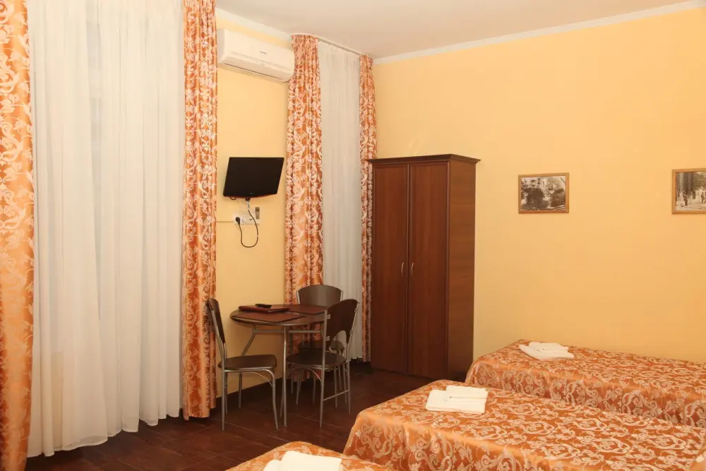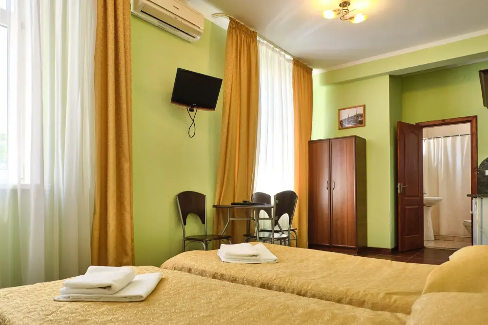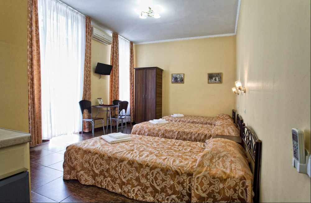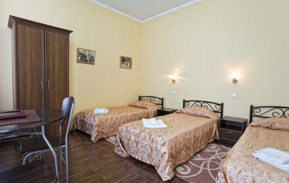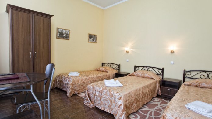 В номере балкон, отопление, кондиционер, wi-fi, плиточный пол, шкаф, сейф, TV с плоским экраном, спутниковые каналы, мини-кухня: эл. плита, мойка, чайник, холодильник, кухонные принадлежности, электрический чайник, обеденный уголок, туалет, душ, фен, одноразовые тапочки, полотенца, сан. узел,. Кровати: 3 односпальных (раздельных) кровати. Возможно доп.место: раскладушка.