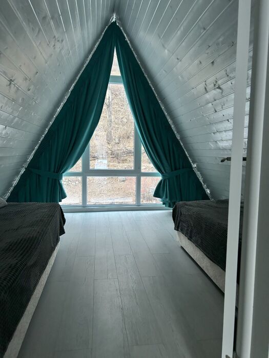 Наверху располагаются две спальные комнаты, в каждой стоит по две односпальных кровати с панорамными окнами с невероятным видом, который будет вас встречать каждое утро.