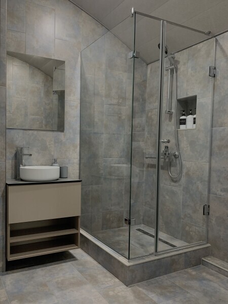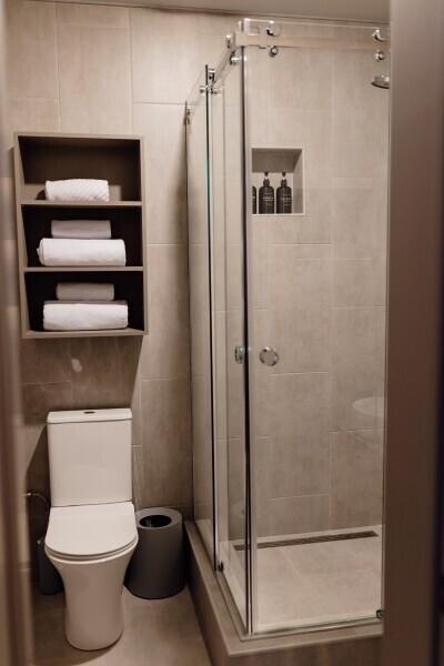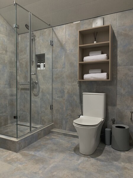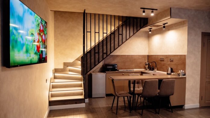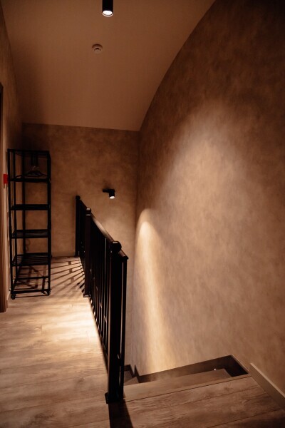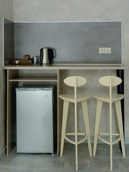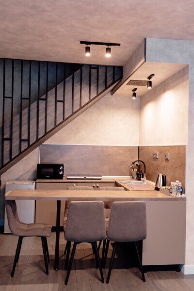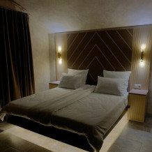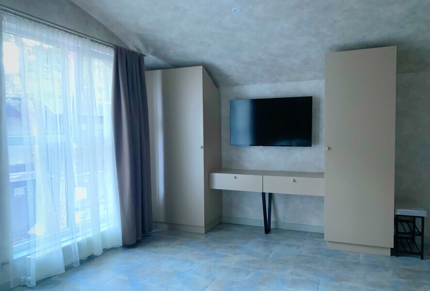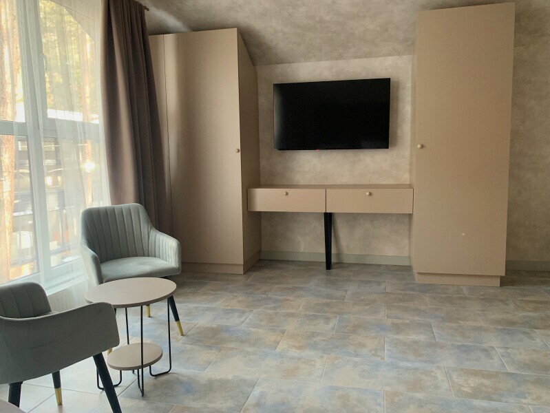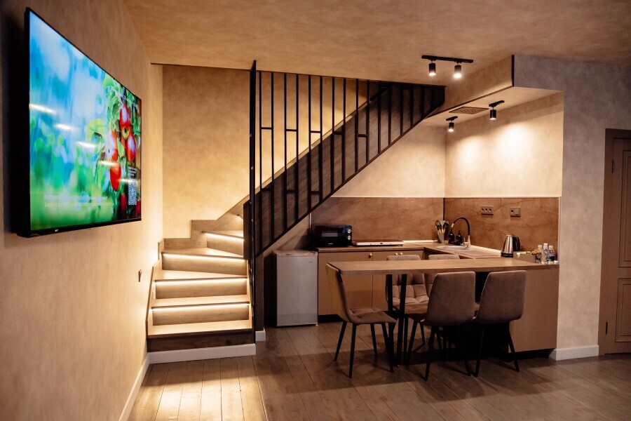 Двухэтажный номер с отдельным частным входом, двумя санузлами, кухней, двумя спальнями с 2-местными кроватям и гостиной.
