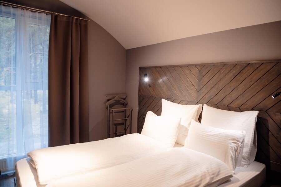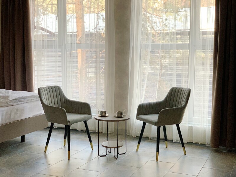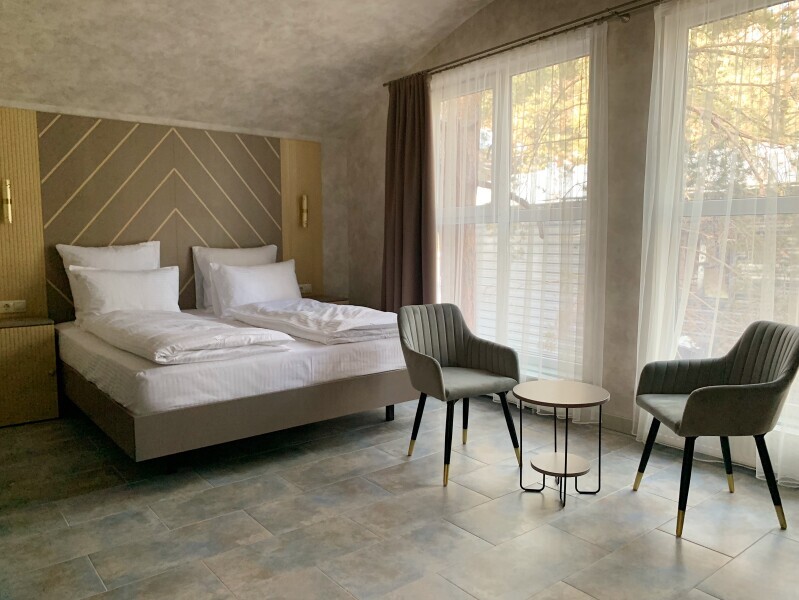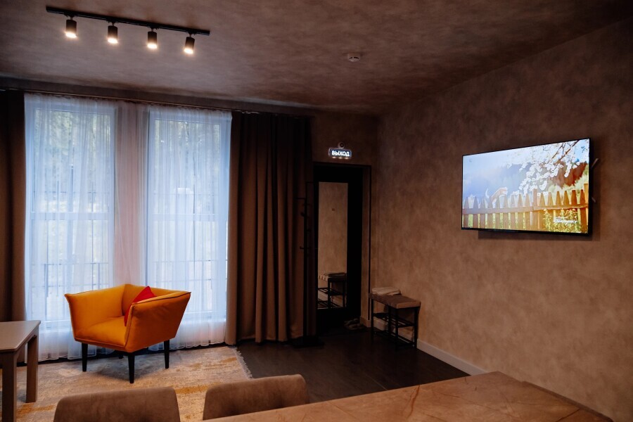 Витражные окна номеров позволят насладиться видом заповедного соснового бора и горных вершин Кавказа.