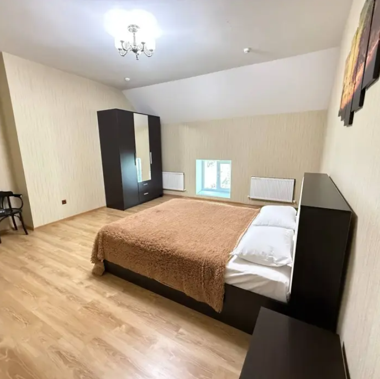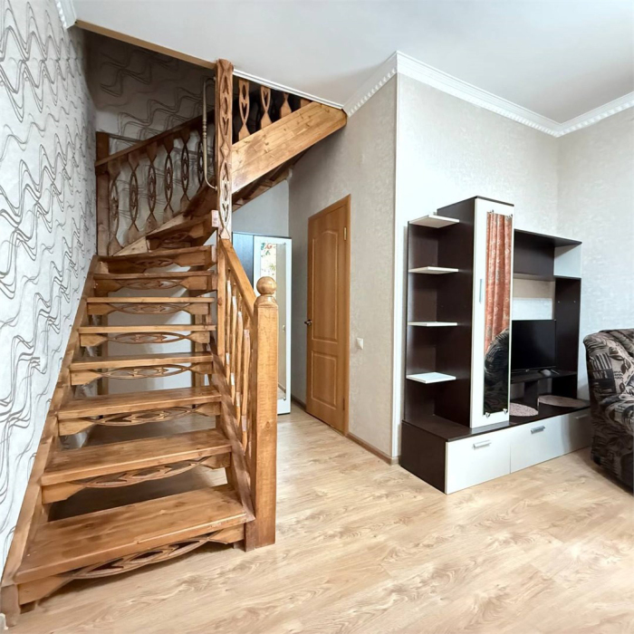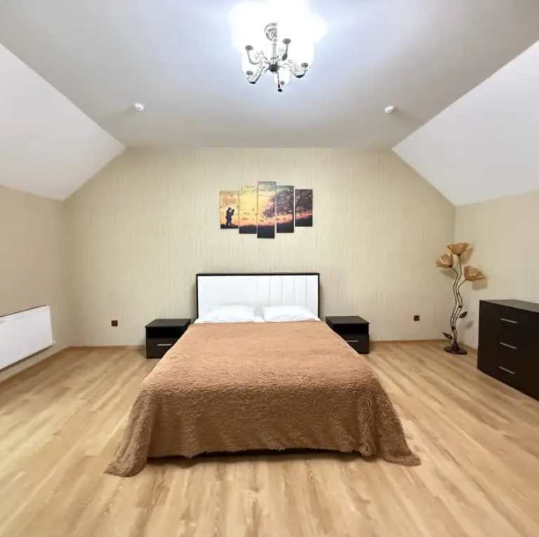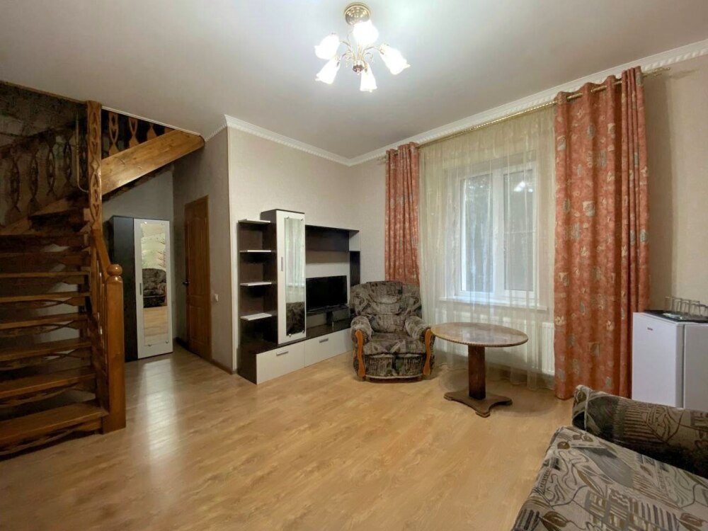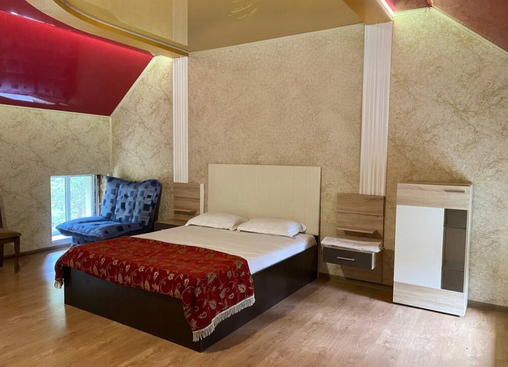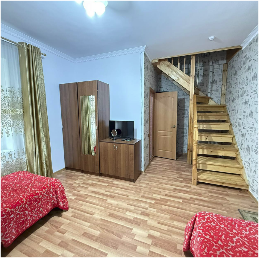 Двухэтажный семейный люкс с двуспальной кроватью на втором этаже и диваном. Два санузла