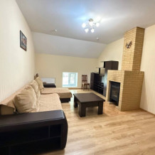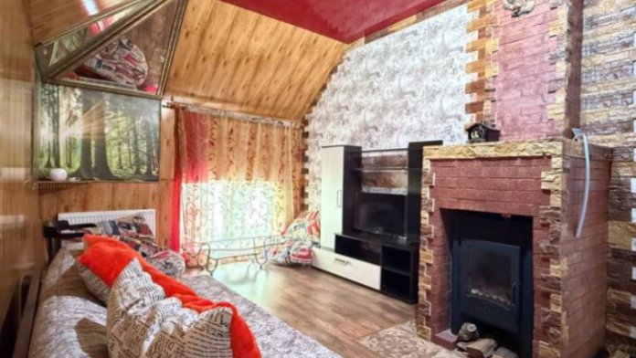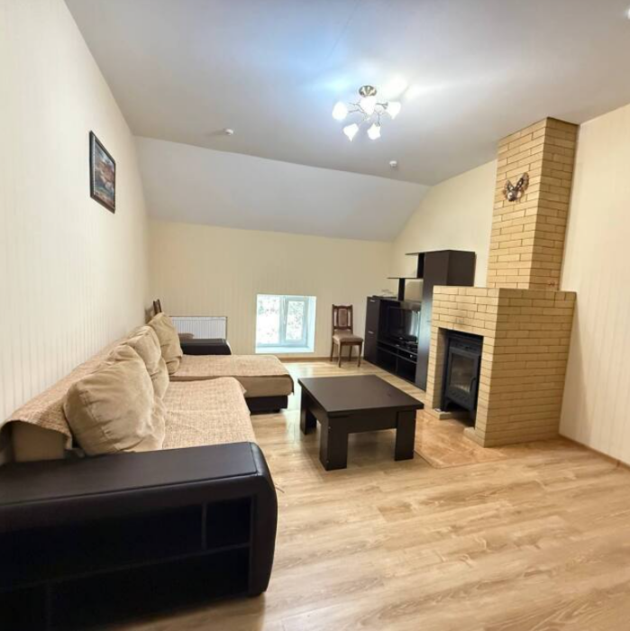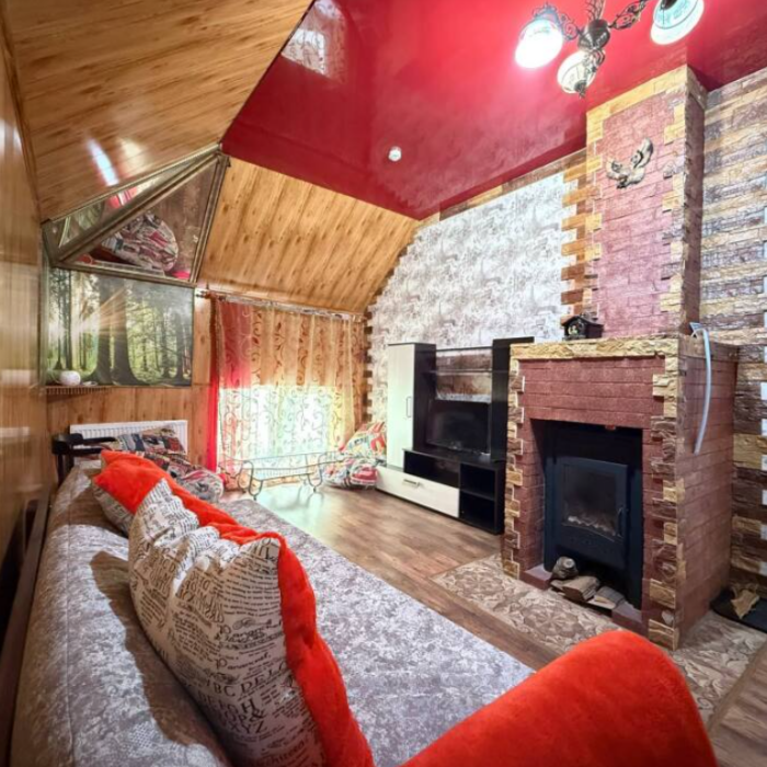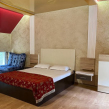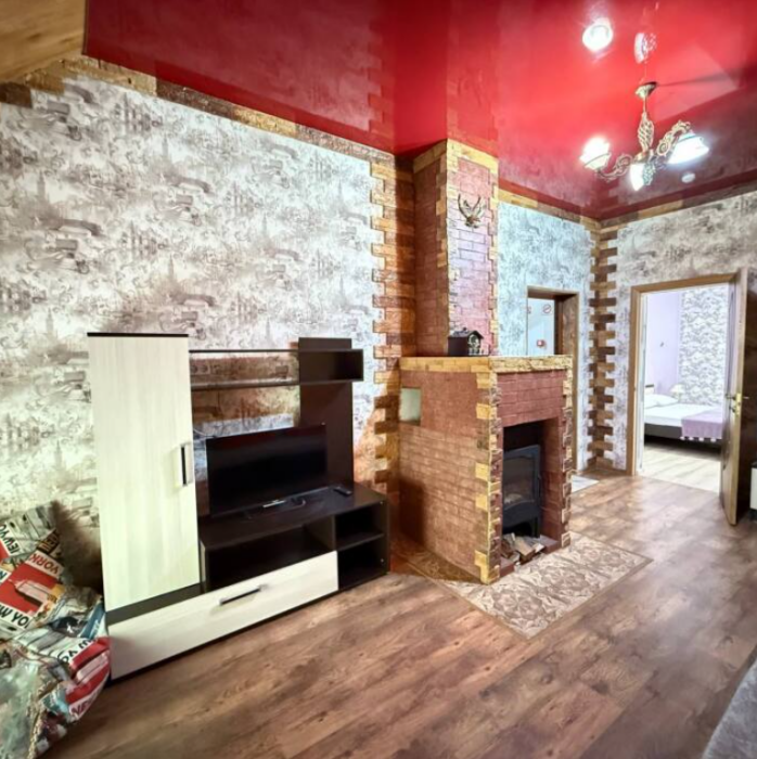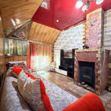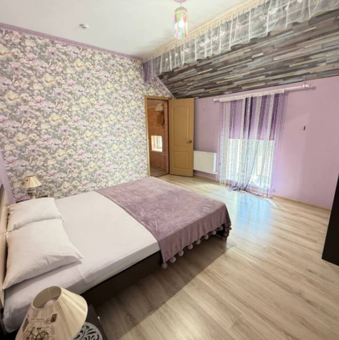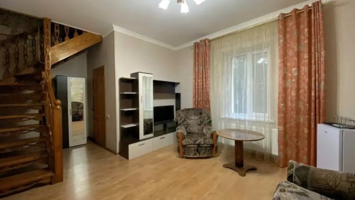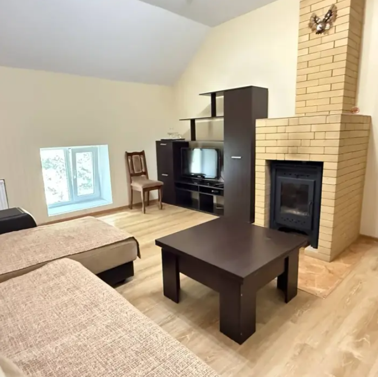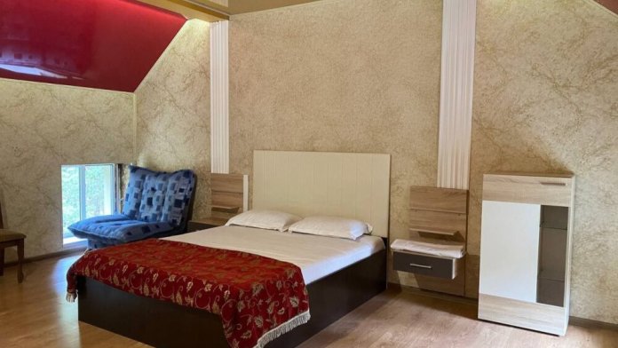 Двухэтажный семейный люкс с двуспальной кроватью на втором этаже и диваном. Два санузла