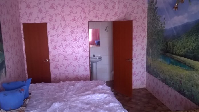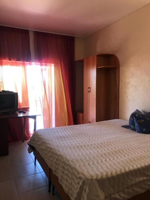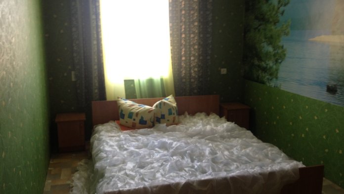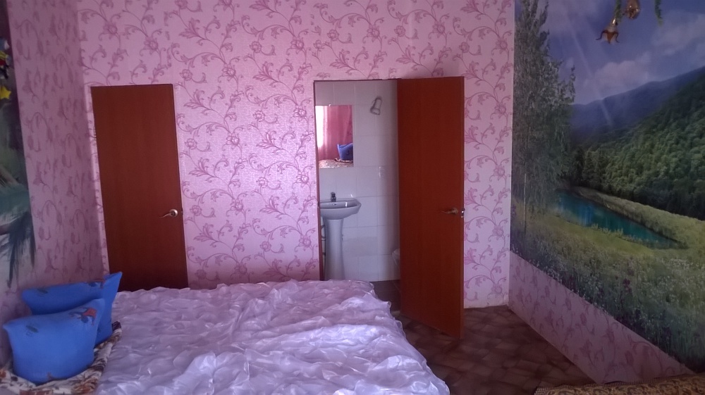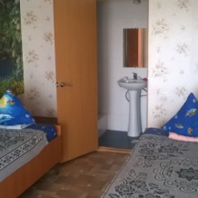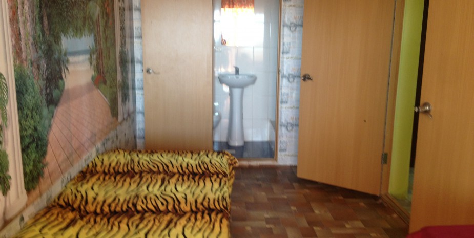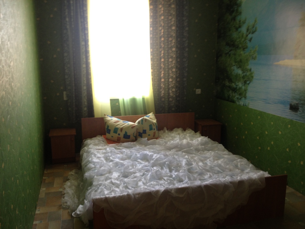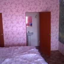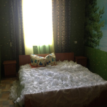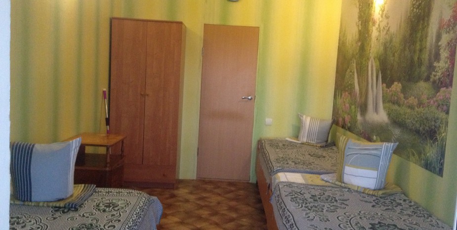 Одна односпальная и одна двухспальная кровать, встроенный шкаф ,трюмо, тумбочка, санузел.