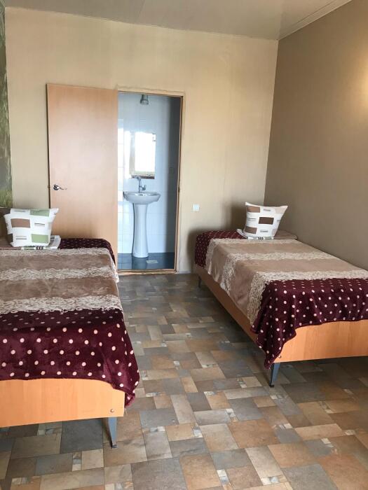 В номере: санузел (душ,умывальник,унитаз), две односпальные кровати, стол, шкаф, стулья, тумбочка.
