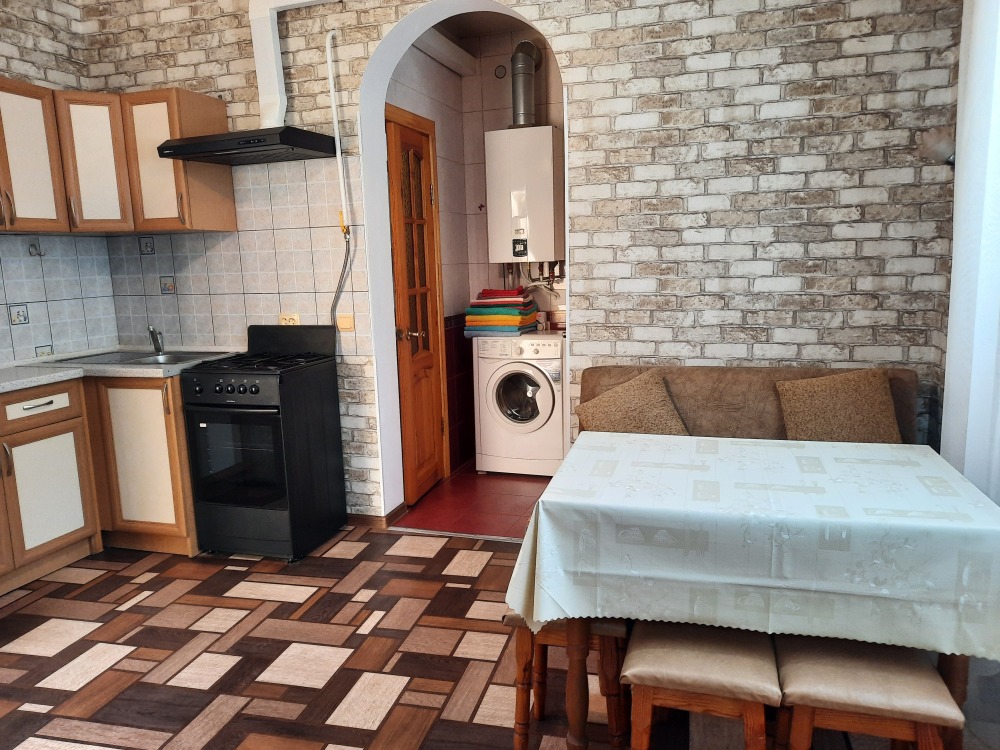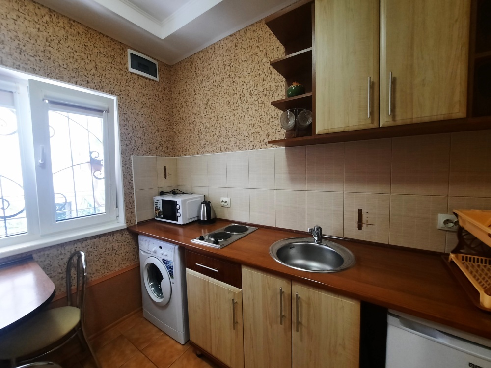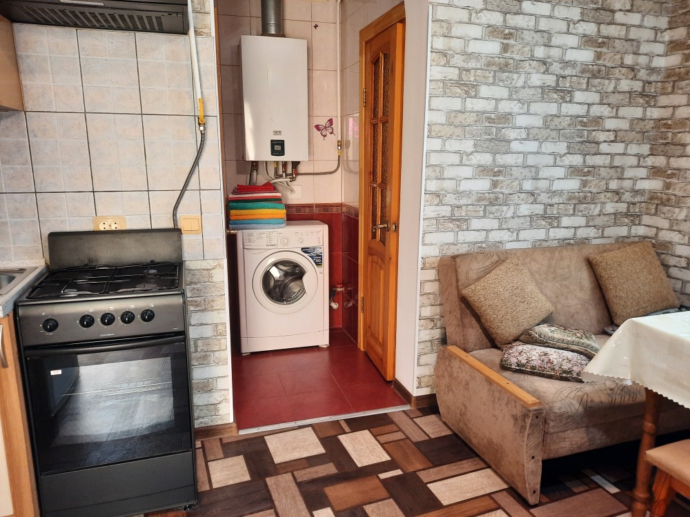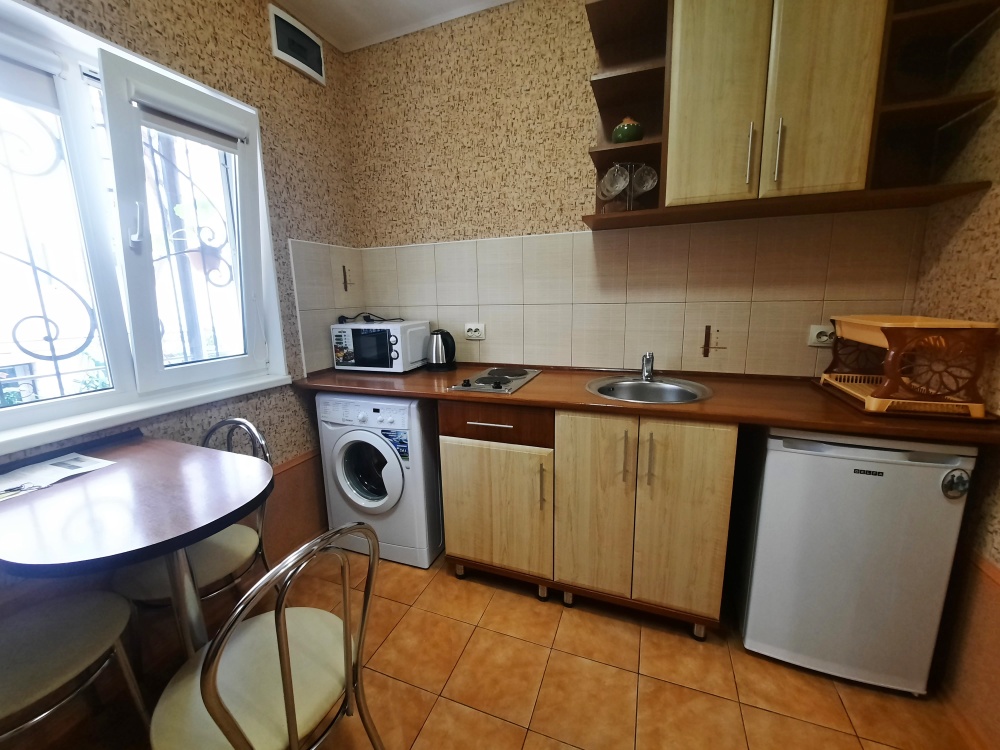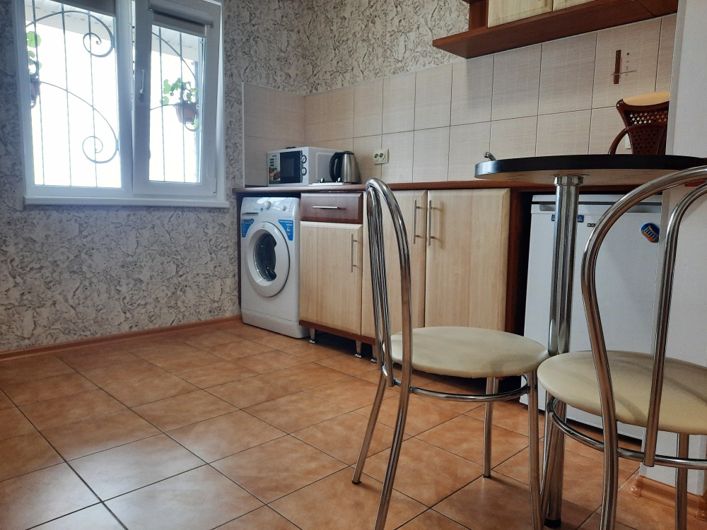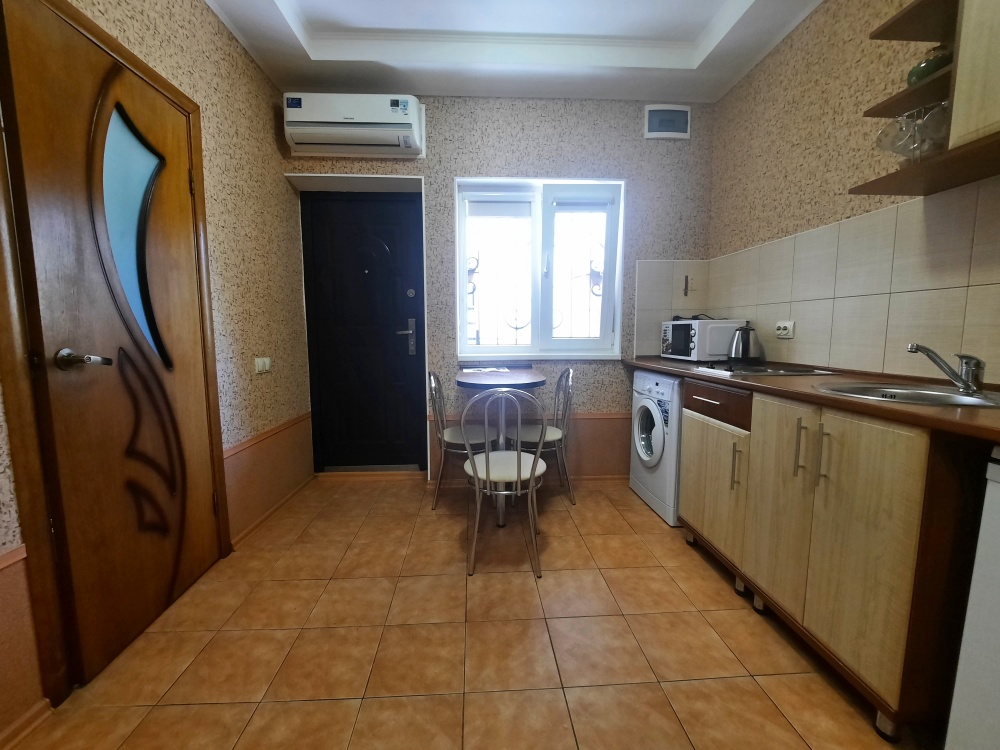 Две изолированные комнаты и проходная кухня-гостиная: двух спальная кровать, три раскладных дивана (пять полноценных спальных мест), шкаф, два телевизора, два кондиционера, кухонный уголок, посуда, холодильник, газовая плита, микроволновая печь, стиральная машина, утюг, фен, wi-fi. Сан узел, душевая кабина. Горячая и холодная вода круглосуточно. Автономное отопление позволяет комфортно отдыхать и в зимний период. При входе столик и стулья. Уборка, смена постельного белья и полотенец бесплатно, один раз в неделю.