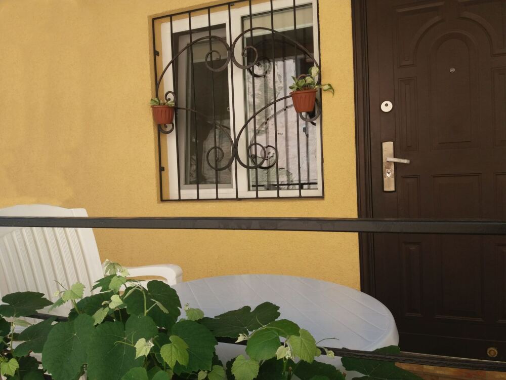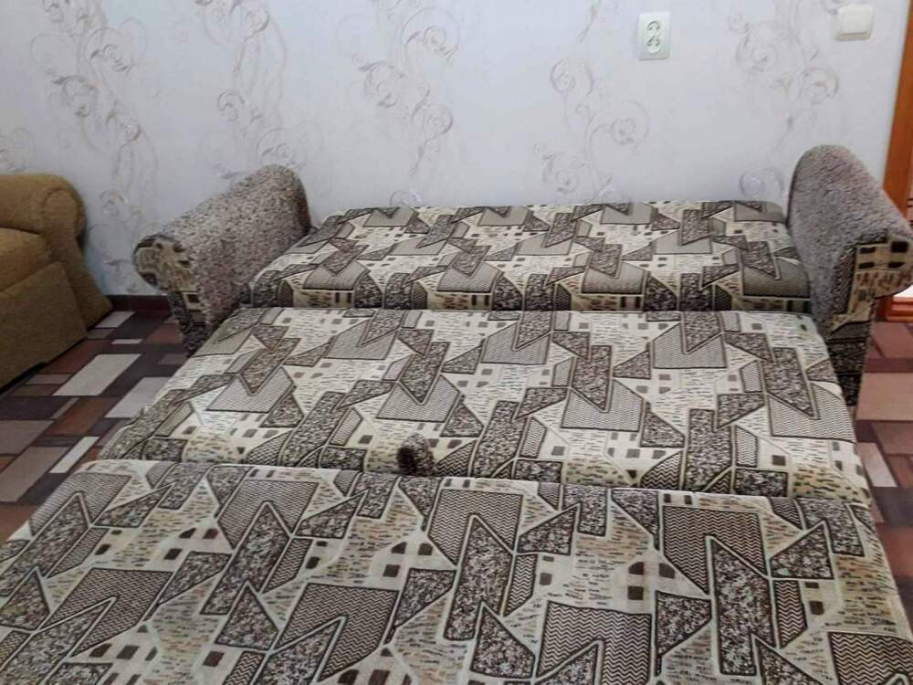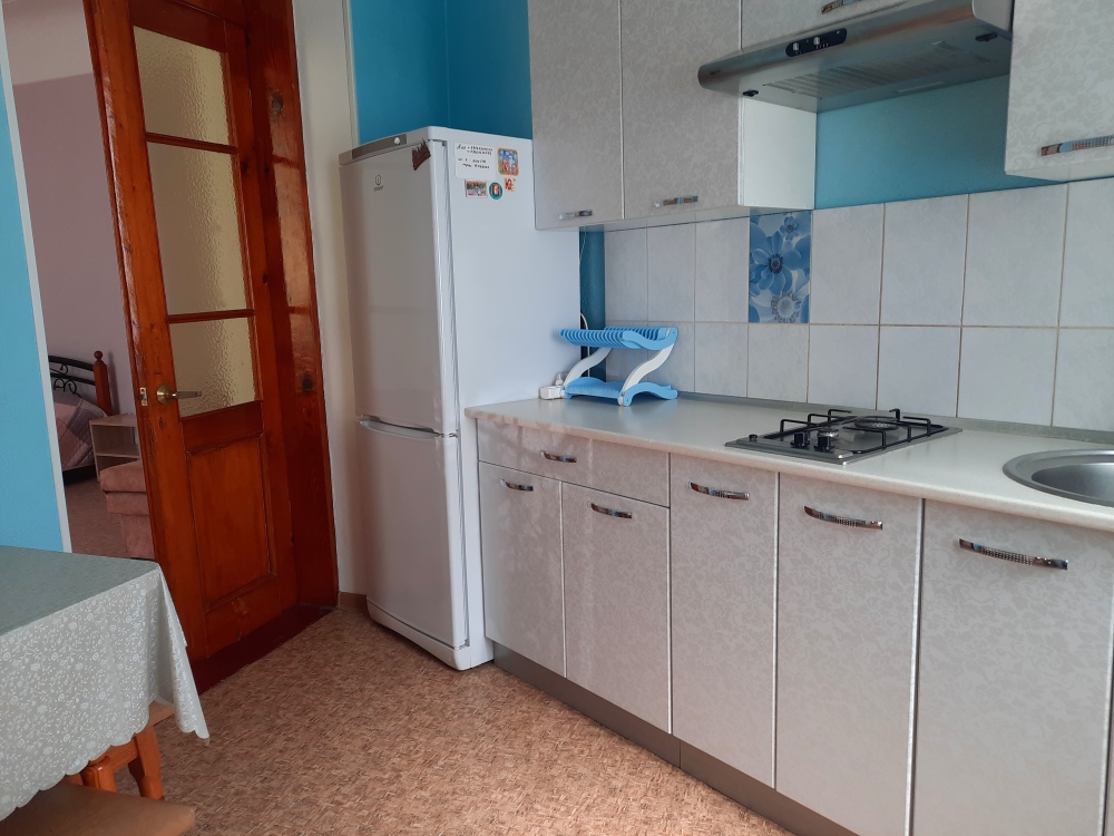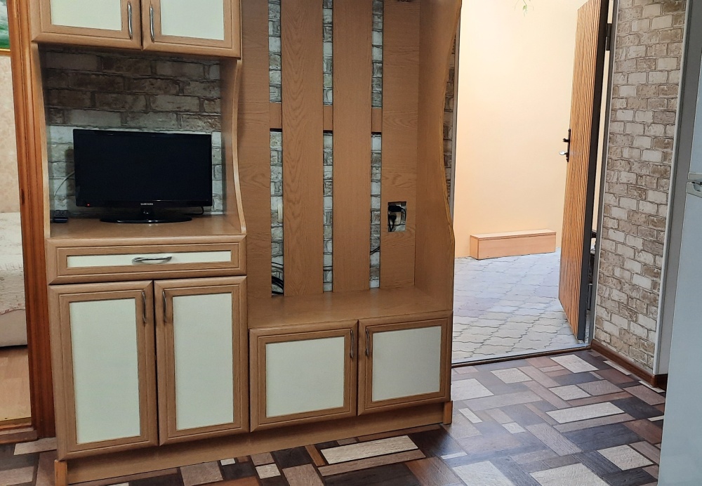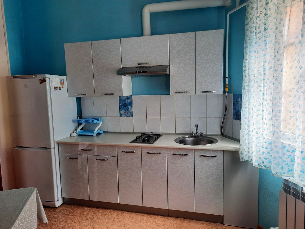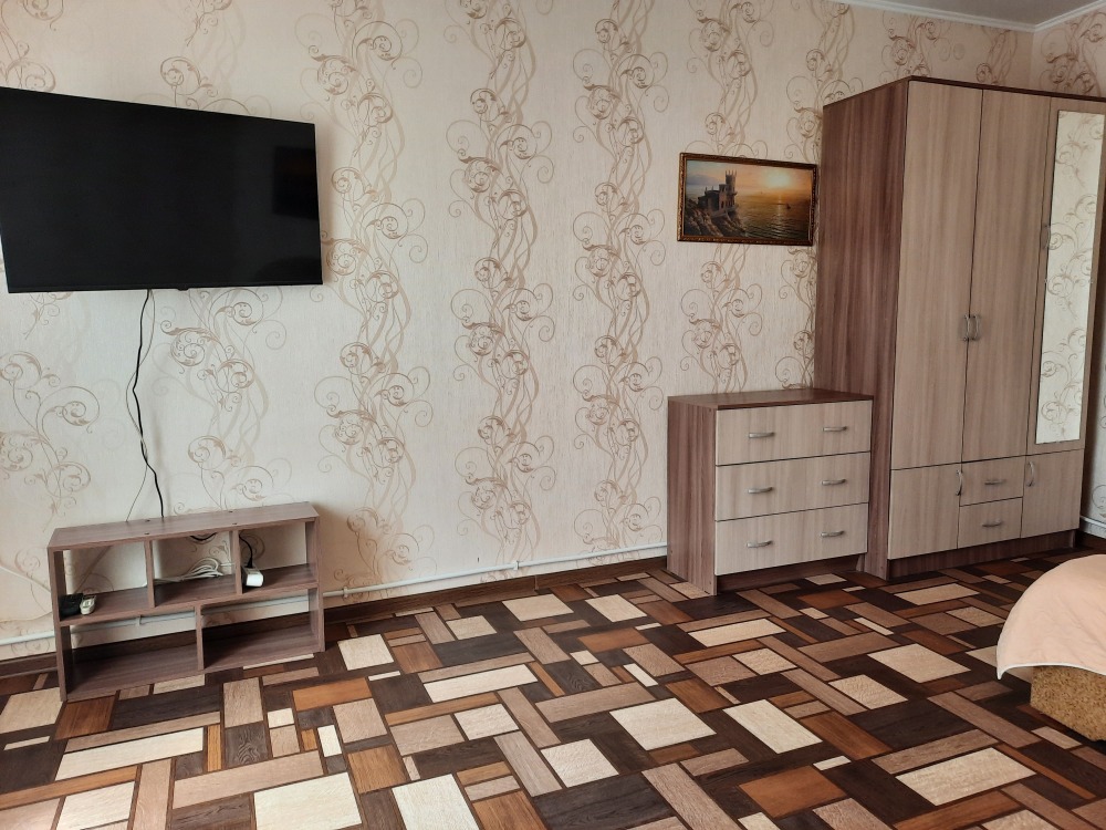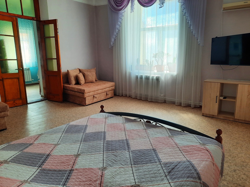 Две изолированные комнаты и проходная кухня-гостиная: двух спальная кровать, три раскладных дивана (пять полноценных спальных мест), шкаф, два телевизора, два кондиционера, кухонный уголок, посуда, холодильник, газовая плита, микроволновая печь, стиральная машина, утюг, фен, wi-fi. Сан узел, душевая кабина. Горячая и холодная вода круглосуточно. Автономное отопление позволяет комфортно отдыхать и в зимний период. При входе столик и стулья. Уборка, смена постельного белья и полотенец бесплатно, один раз в неделю.