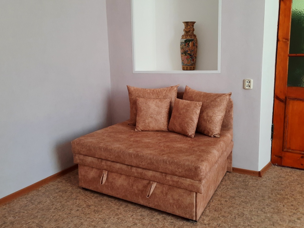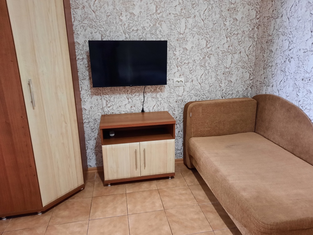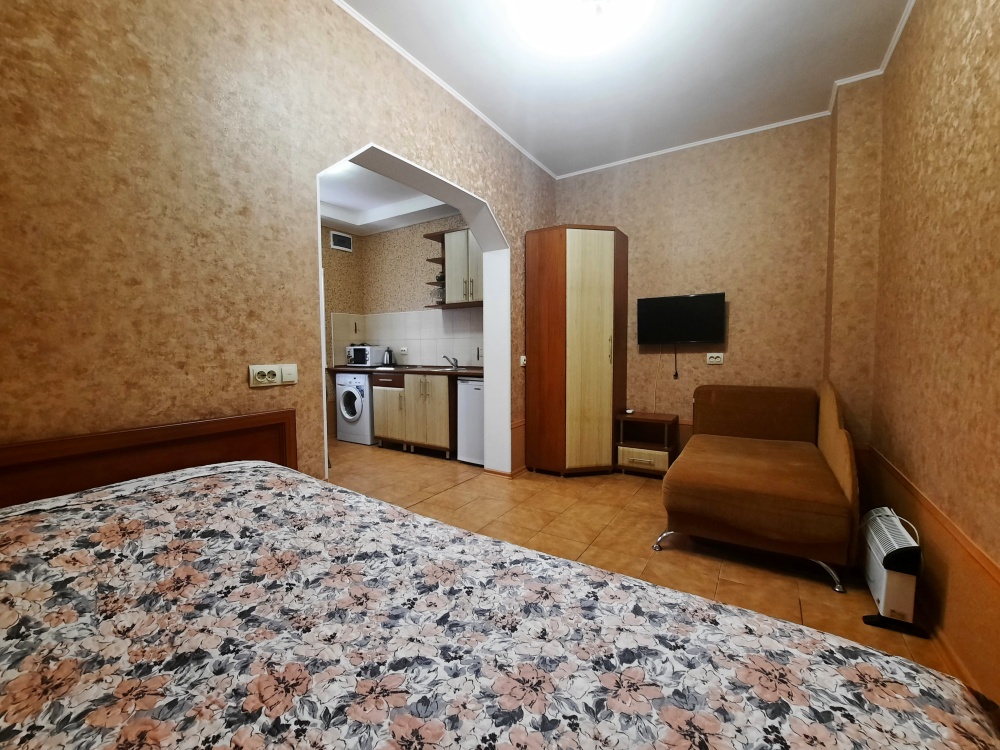 Есть все для комфортного отдыха. Большая двухспальная кровать и раскладной диван-тубус (три полноценных спальных места), шкаф, кухонный уголок (вся необходимая посуда), телевизор, кондиционер, утюг, фен, электрическая плита, микроволновая печь, холодильник, электро чайник, стиральная машина, wi-fi. Горячая и холодная вода круглосуточно. При входе столик и стулья. Уборка, смена постельного белья и полотенец бесплатно, один раз в неделю.