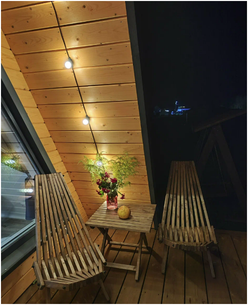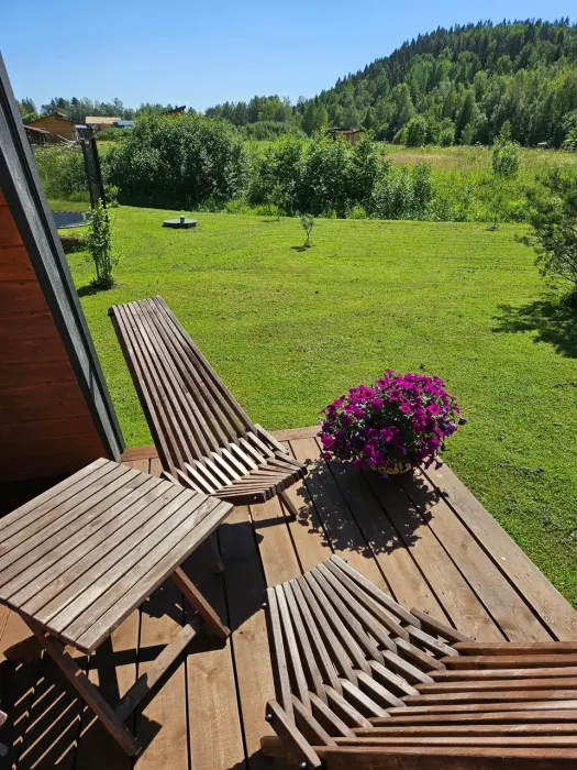- на террасе с видом на речку и лес шезлонги и стол для утреннего чаепития;
