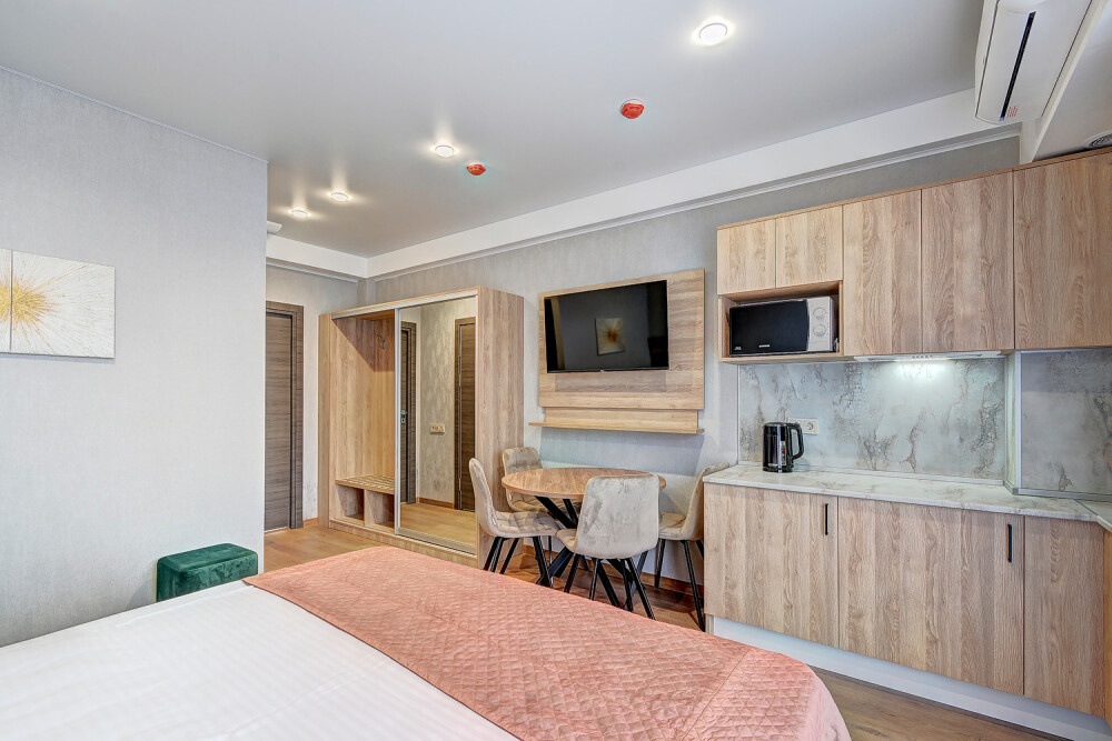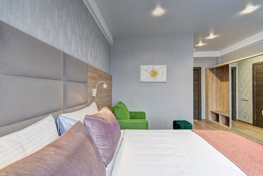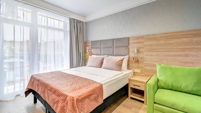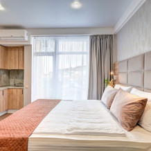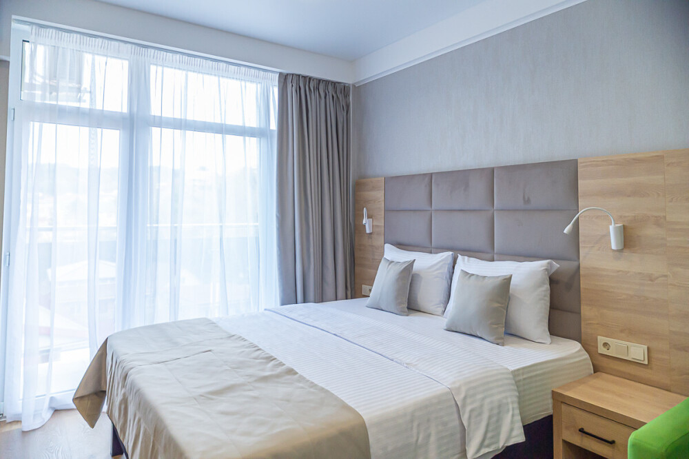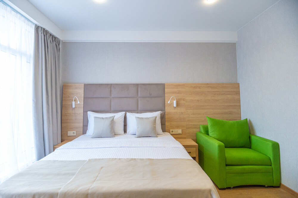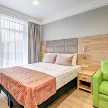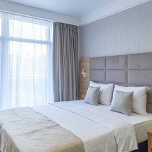 В номере одна двуспальная или две односпальные кровати (под запрос).