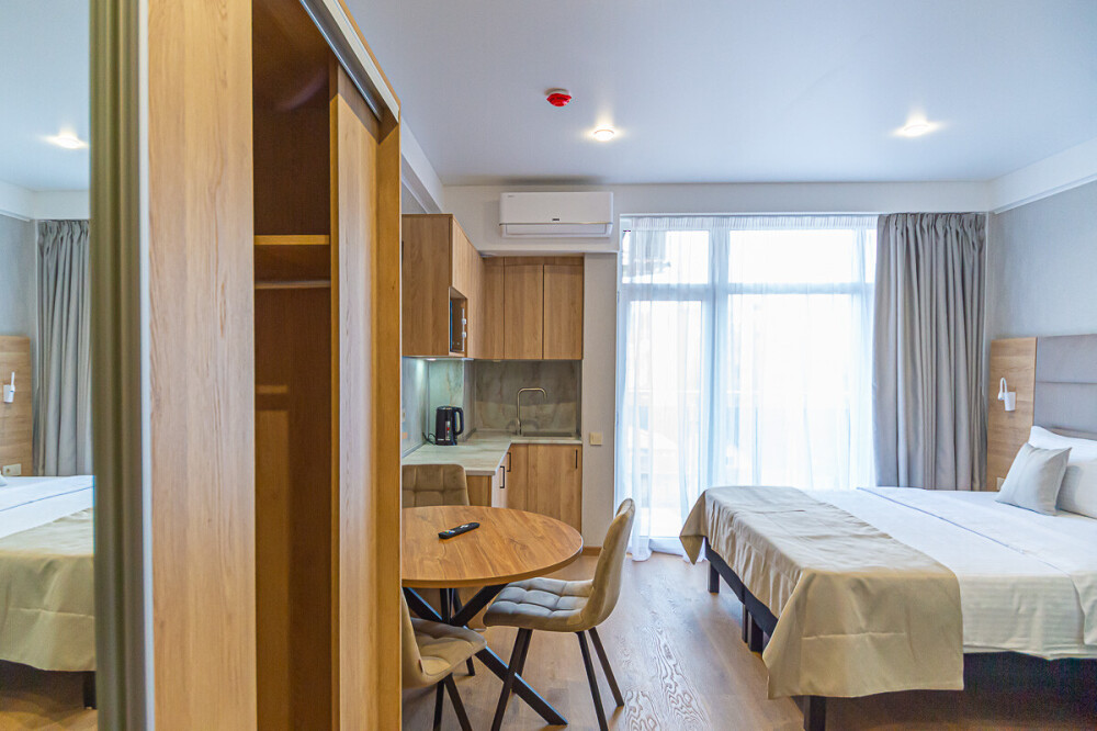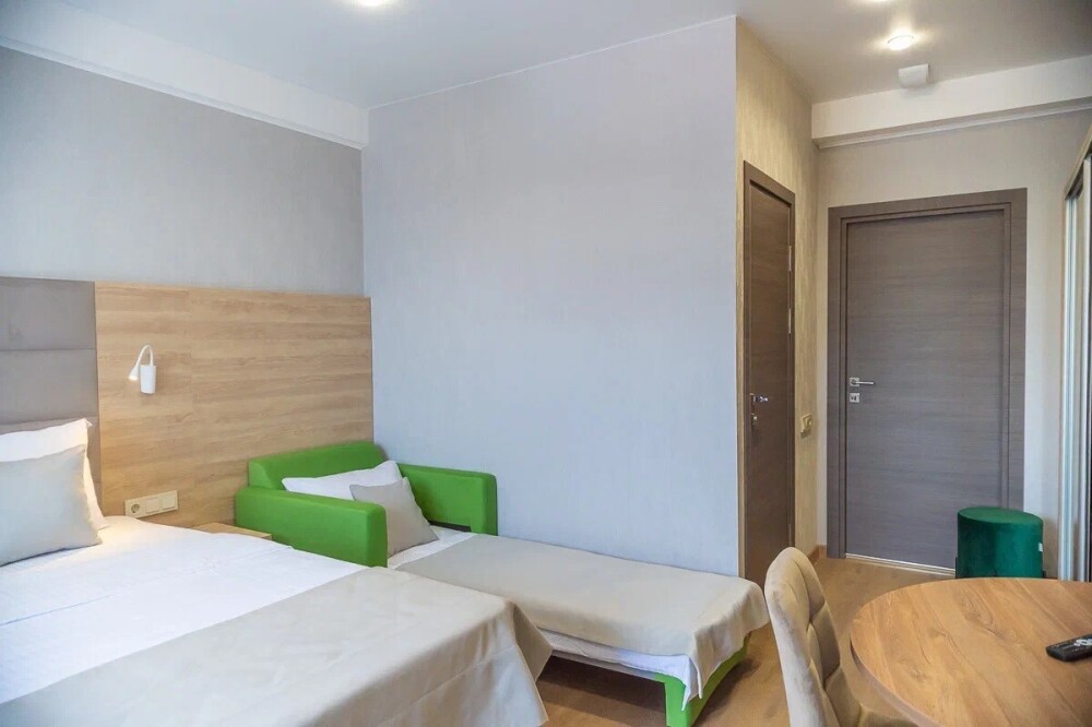 До пляжа можно дойти пешком за несколько минут по ровной дороге, без крутых спусков и пересечения проезжей части. Отель находится в тихом районе, при этом рядом есть объекты городской инфраструктуры. В пешей доступности расположена железнодорожная станция, что удобно для перемещений по побережью и поездок в центр Сочи.