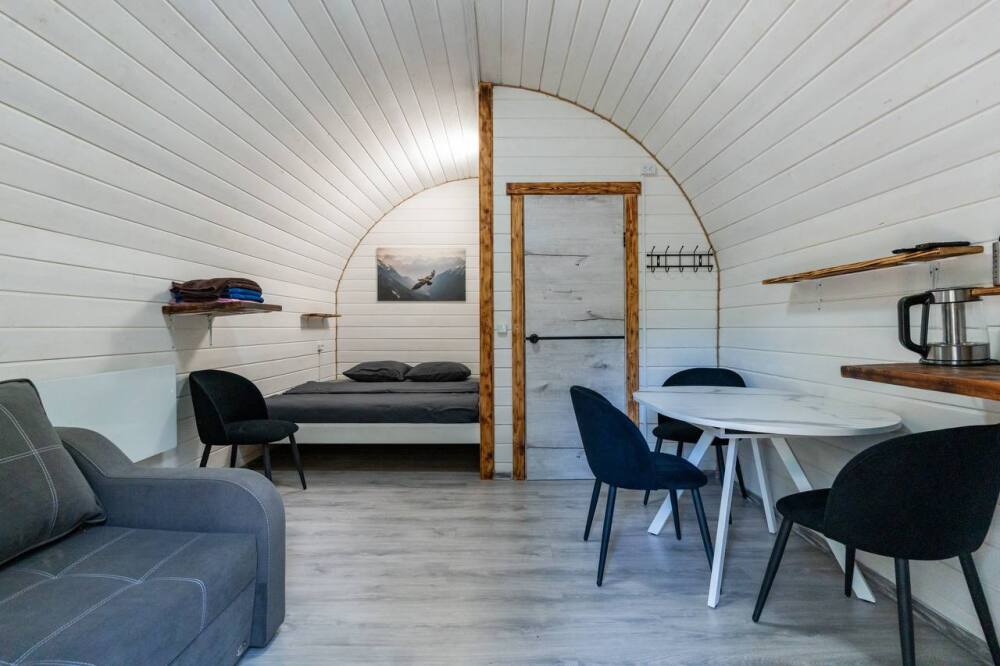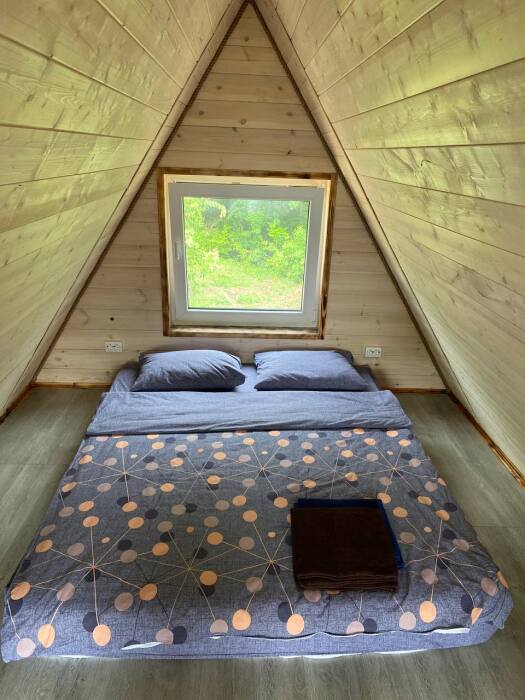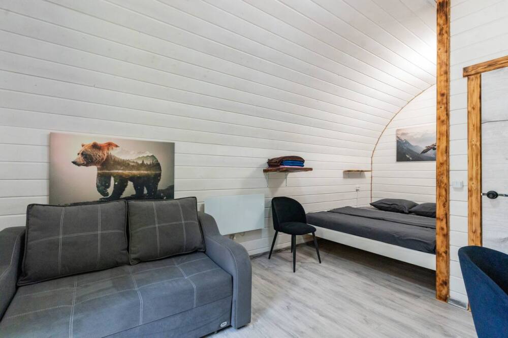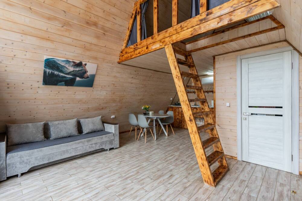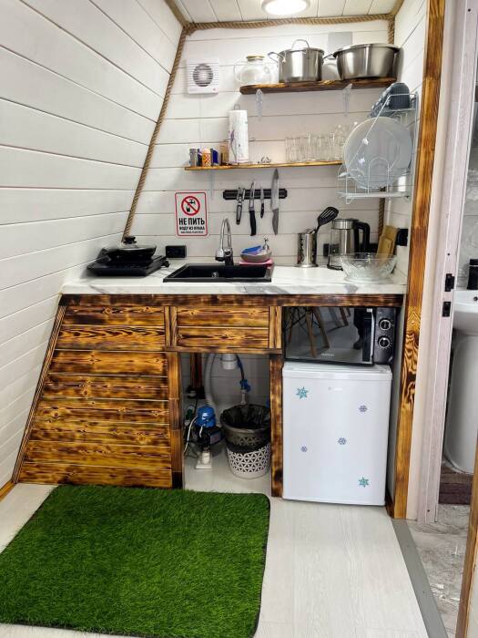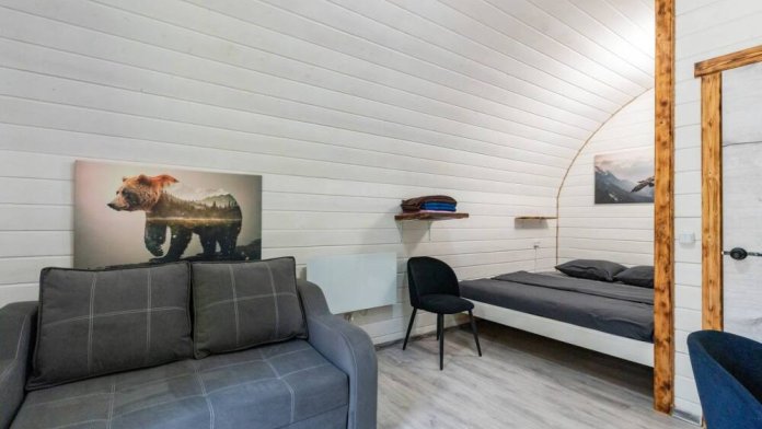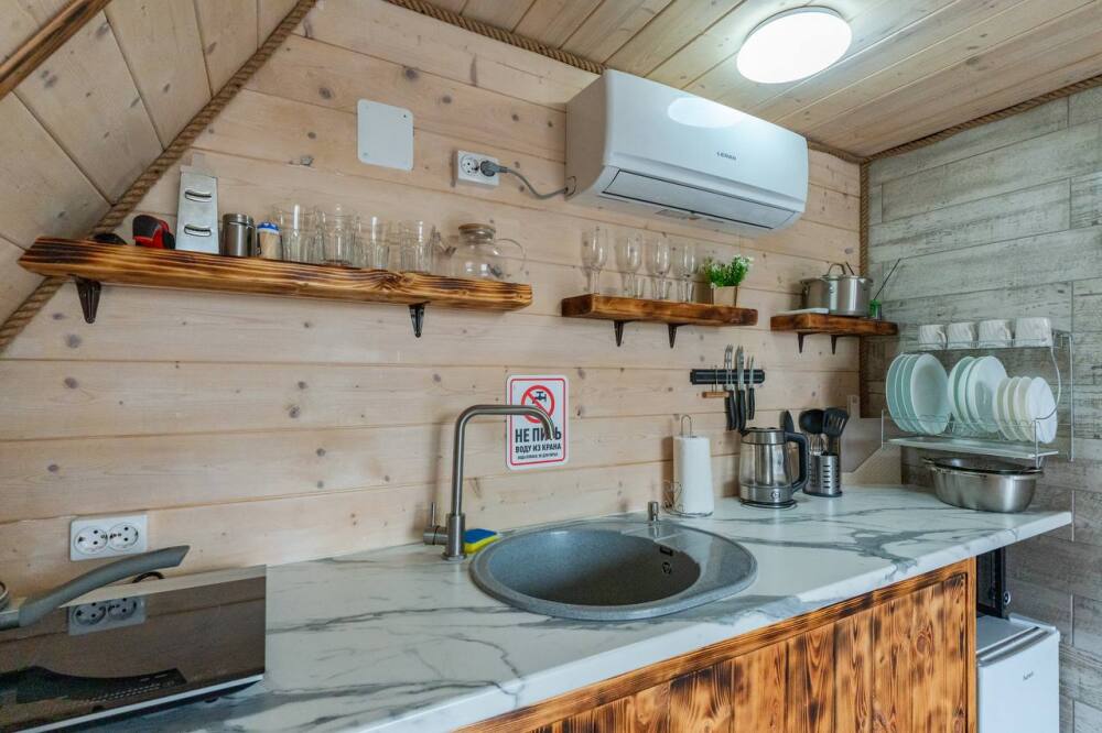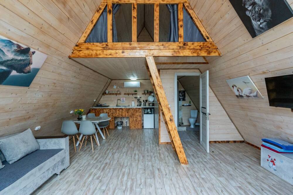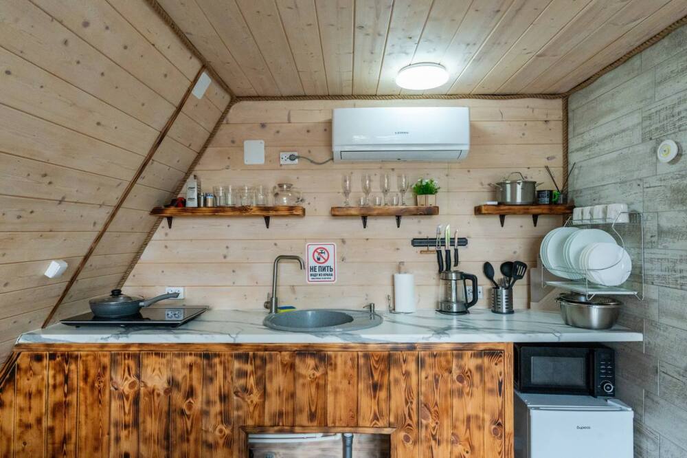Для размещения гостям предлагают дома А-фрейм, арочный дом и номера с балконом вместимостью от 2 до 5 гостей. Все дома и номера оснащены: Wi-Fi, кухней, санузлом, кондиционером, холодильником, электрической плитой, микроволновкой, стиральной машиной, водонагревателем, телевизором, феном, посудой, кроватью, диваном, обеденной зоной (стол, стулья).