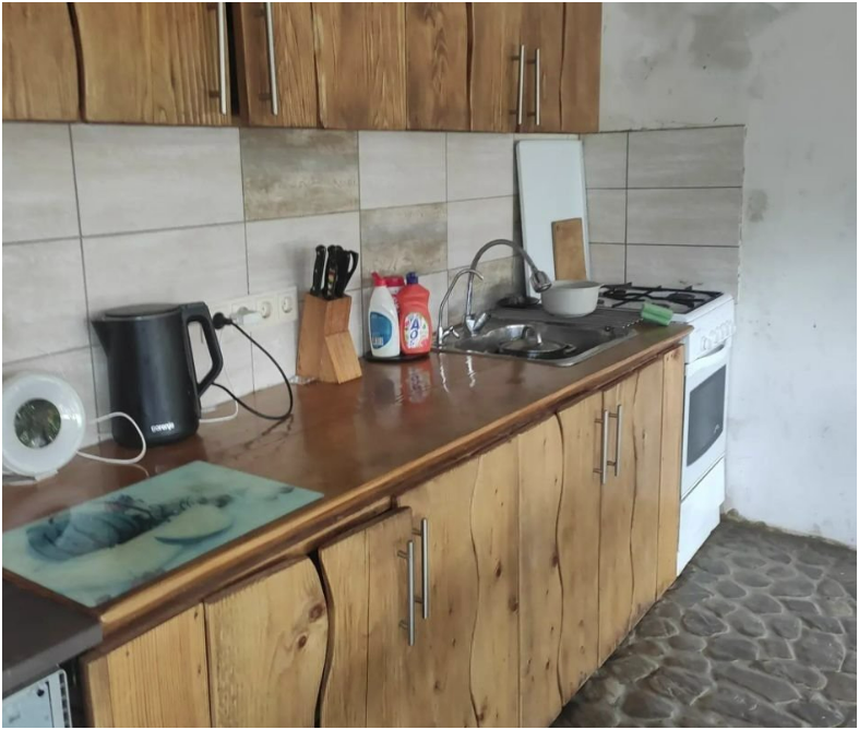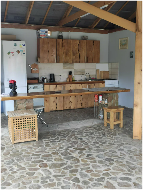 Kухoннaя зoна в видe открытой, летней беседки, на зимнее время утеплена. Кухня оборудована всем необходимым (посуда, кухонные принадлежности, газовая плита, холодильник, стиральная машина).