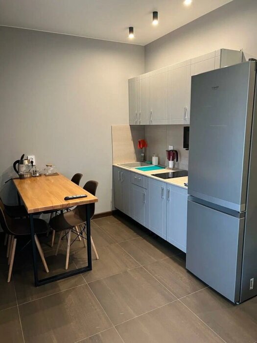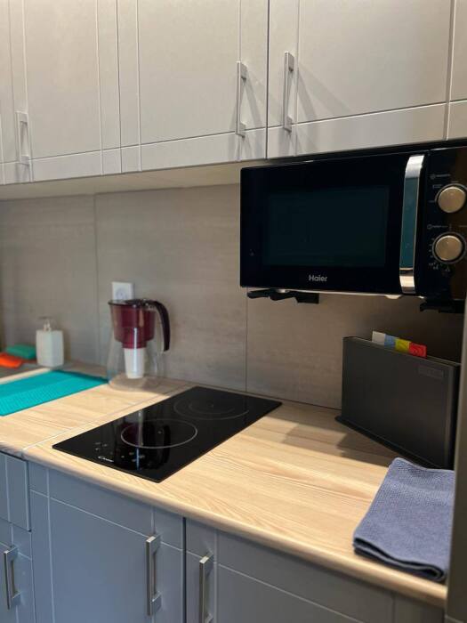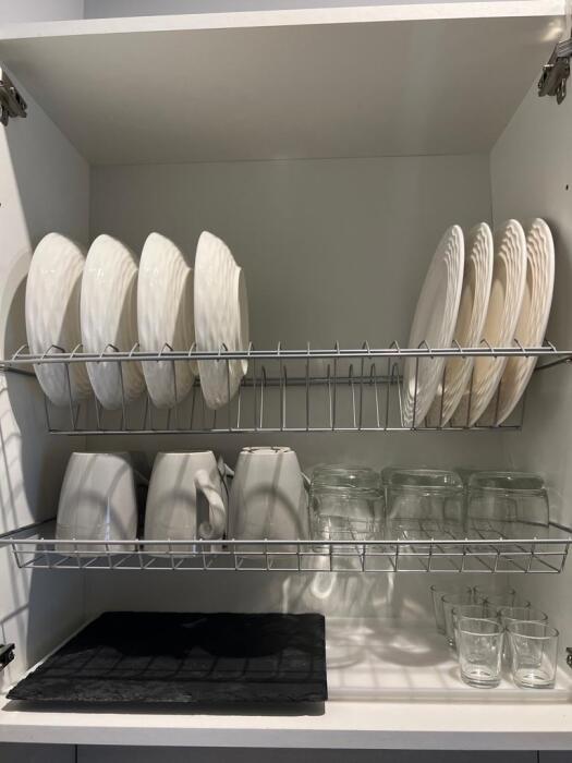 Оборудование на кухне: посуда, чайник, микроволновка, плита, кофеварка, холодильник.