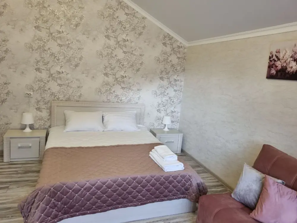 Кровать с ортопедическим основанием 180×200, диван с ортопедическим основанием 160×200, холодильник, микроволновка, фен, полотенца, банные халаты, одноразовые тапочки, гель для душа, шампуни и мыло.