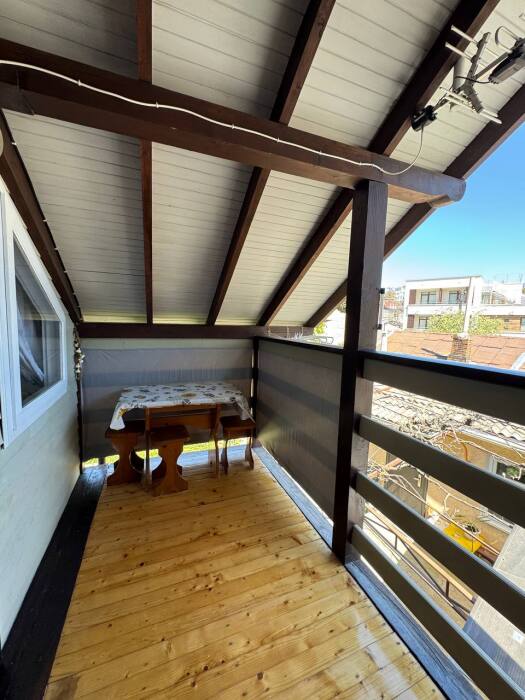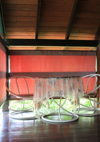 Просторная терраса оборудованная мини-кухней, на которой стоит одноконфорочная индукционная плитка, необходимая посуда, обеденный стол.