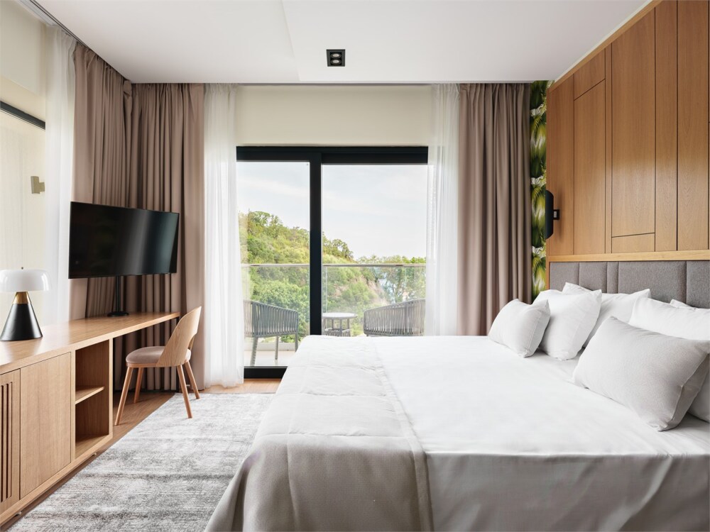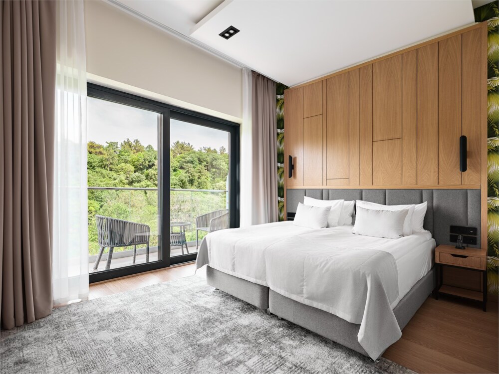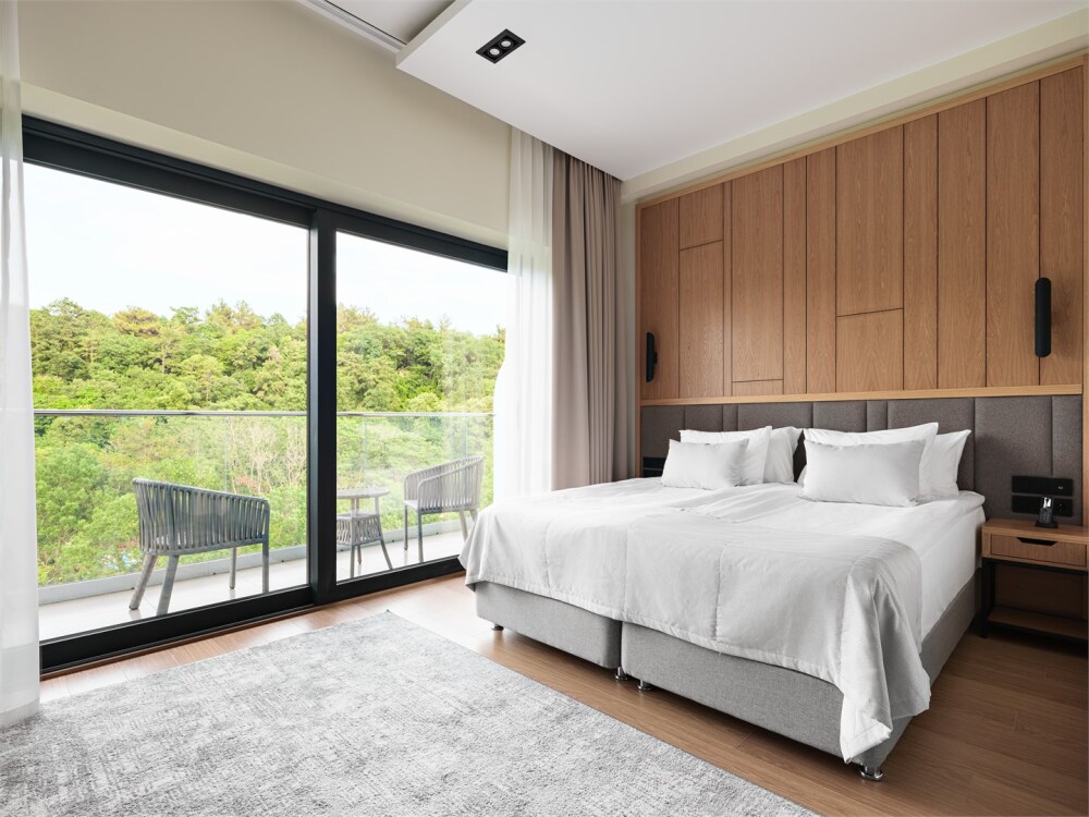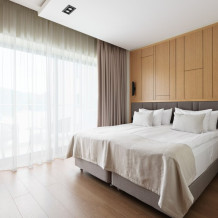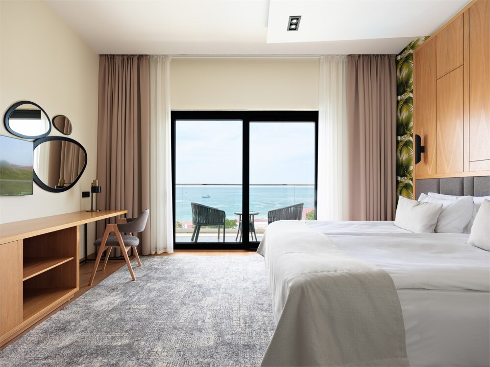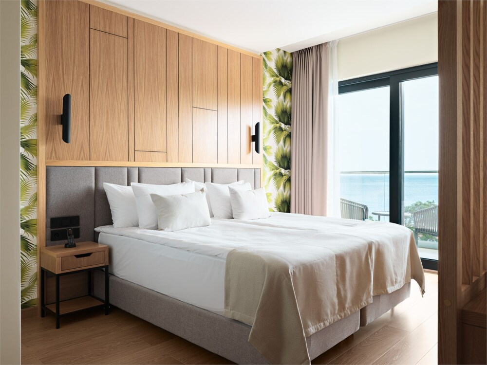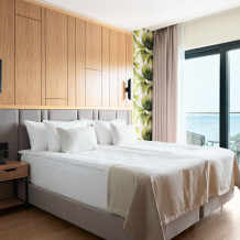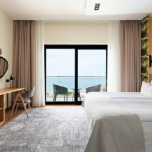 Просторный 3-местный номер с панорамным остеклением и балконом. Номер имеет вид на море. Кровати трансформируется в одну 2-спальную или две 1-спальные кровати шириной 90 см. В качестве третьего места предлагается раскладное кресло-кровать. Возможно размещение ребенка до 3 лет в детской кроватке. Один ребёнок до 4 лет — можно без отдельного спального места.