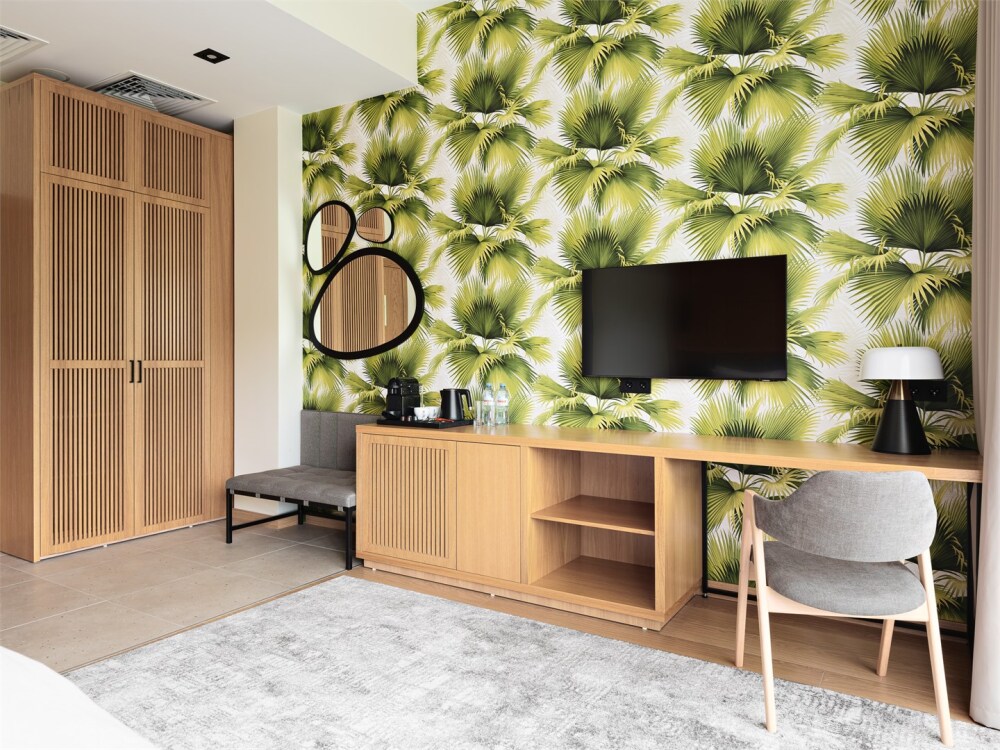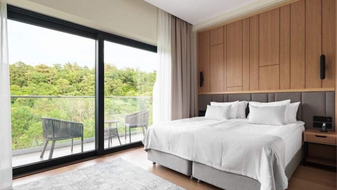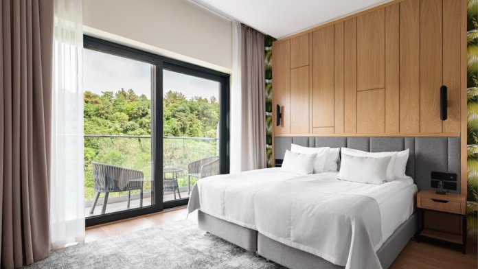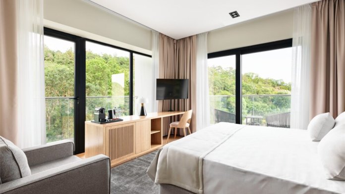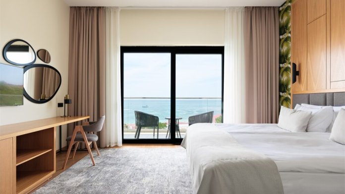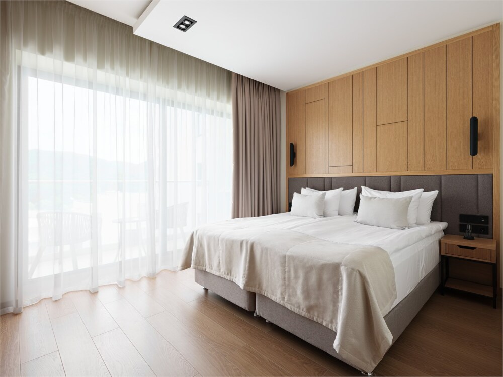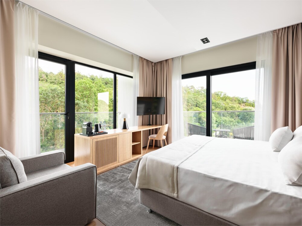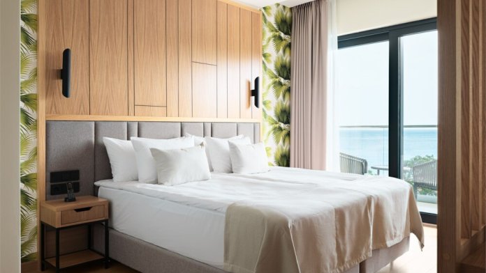 Просторный 3-местный номер с панорамным остеклением и балконом. Номер имеет вид на море. Кровати трансформируется в одну 2-спальную или две 1-спальные кровати шириной 90 см. В качестве третьего места предлагается раскладное кресло-кровать. Возможно размещение ребенка до 3 лет в детской кроватке. Один ребёнок до 4 лет — можно без отдельного спального места.