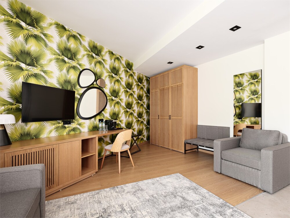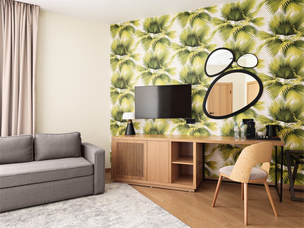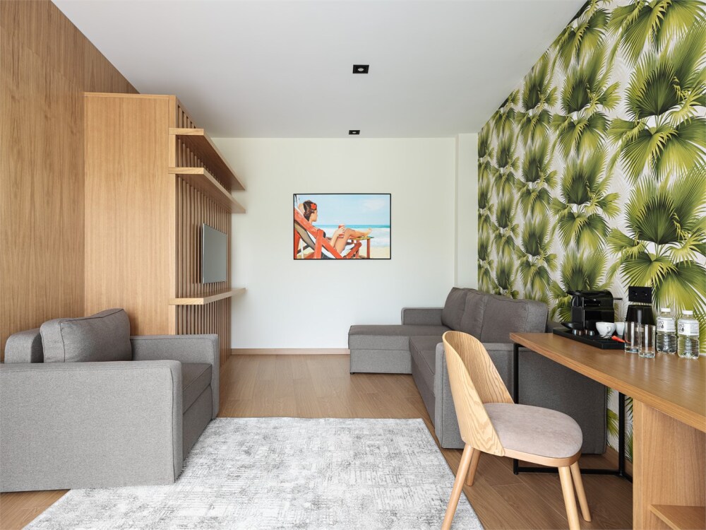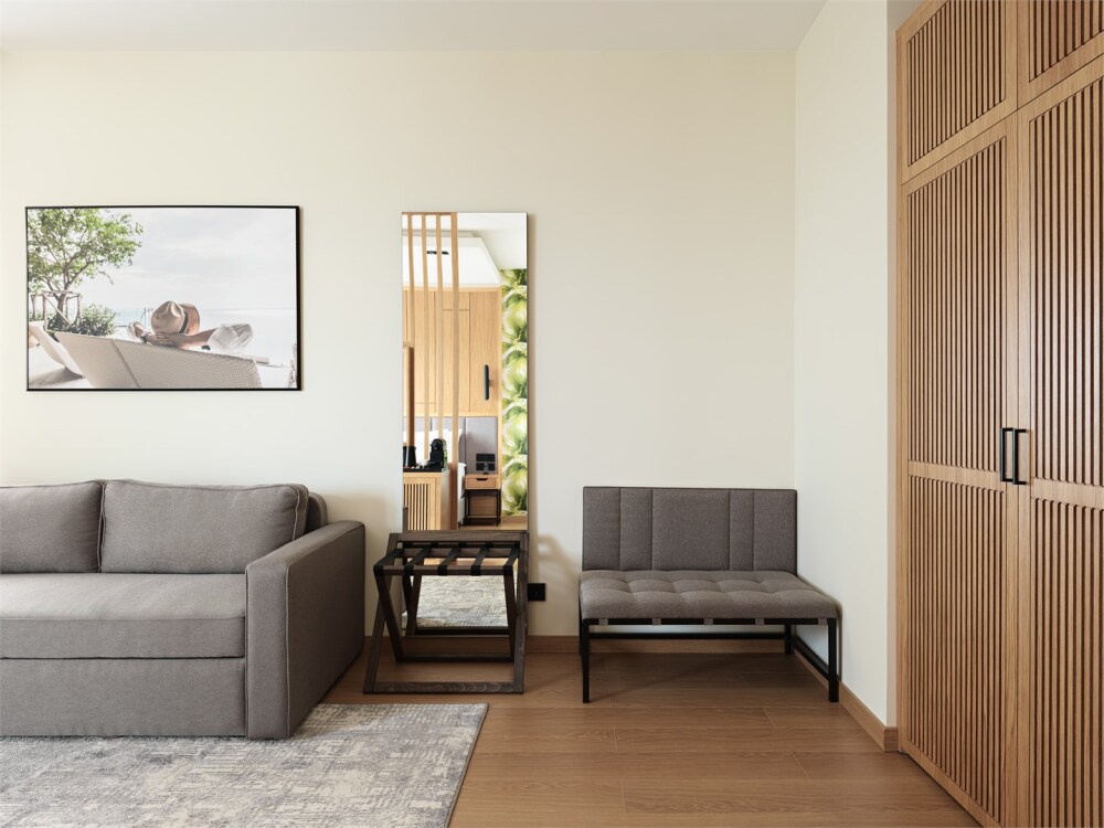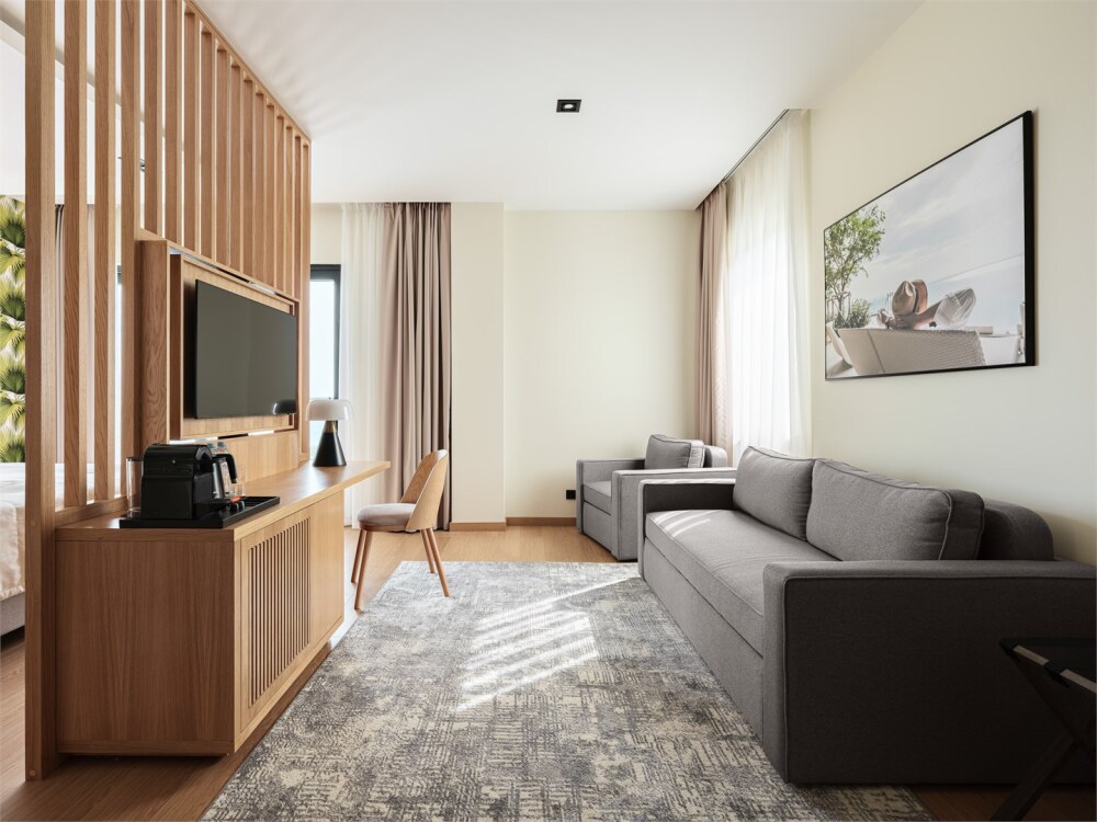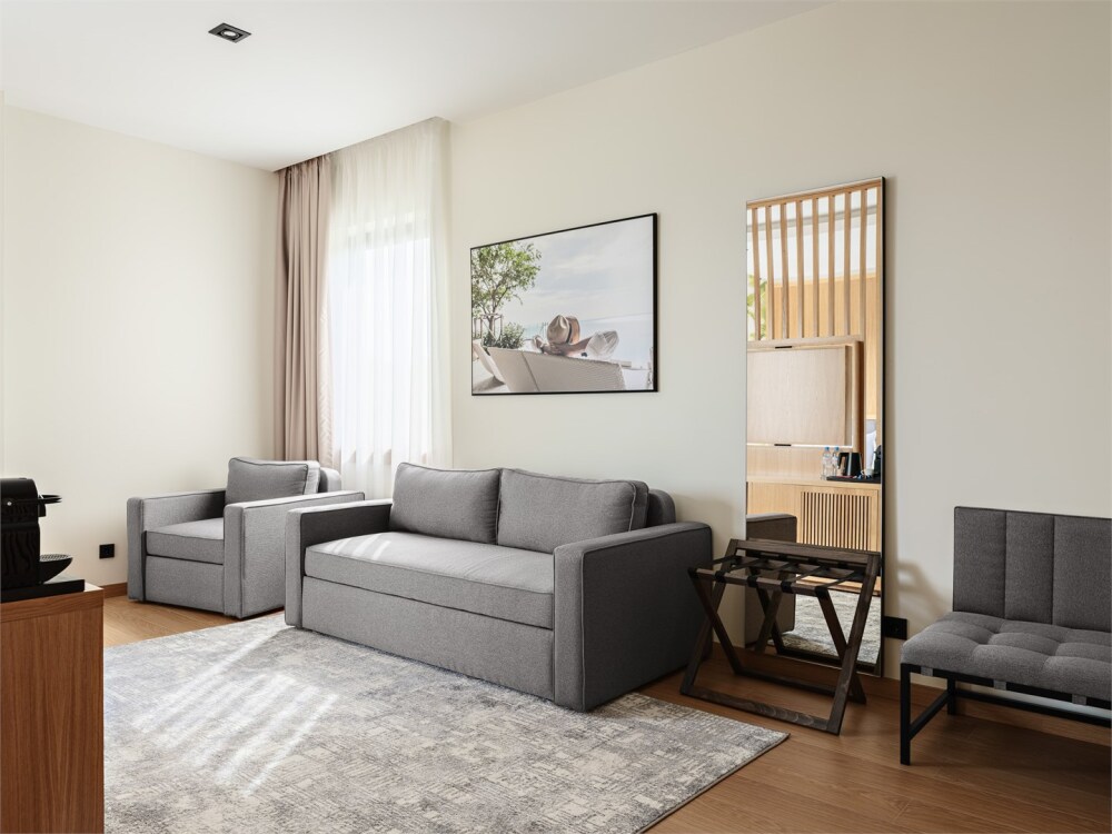 Просторный номер из двух зон идеально подойдет для большой семьи. В номере имеется все необходимо для комфортного проживания - двуспальная кровать, двуспальный диван и кресло-кровать. Дети до 4 лет — можно без отдельного спального места.