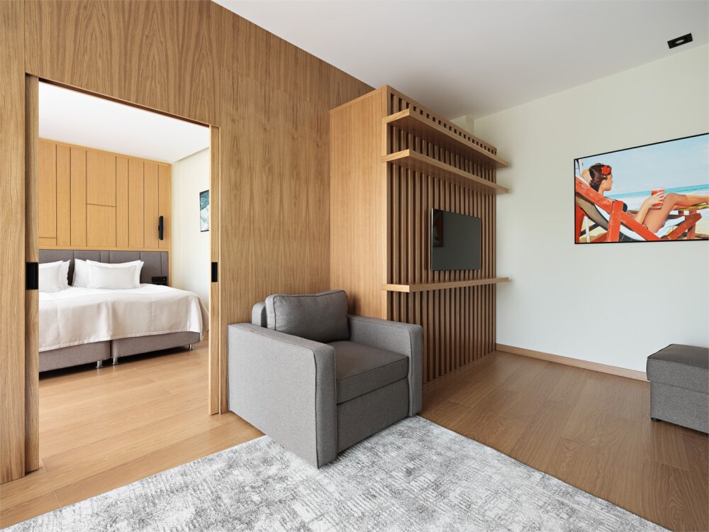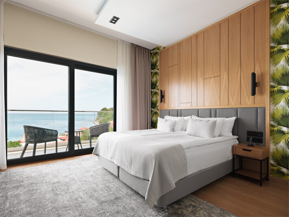 Номер повышенной комфортности с большой 2-спальной кроватью, двуспальным диваном и креслом-кроватью отлично подойдет для размещения, как индивидуальных гостей, так и семьи до 5 человек. Номер имеет балкон, панорамное остекление с видом на море. Номер имеет зонирование, отделяющее спальную зону от зоны отдыха. Один ребёнок до 4 лет — можно без отдельного спального места.