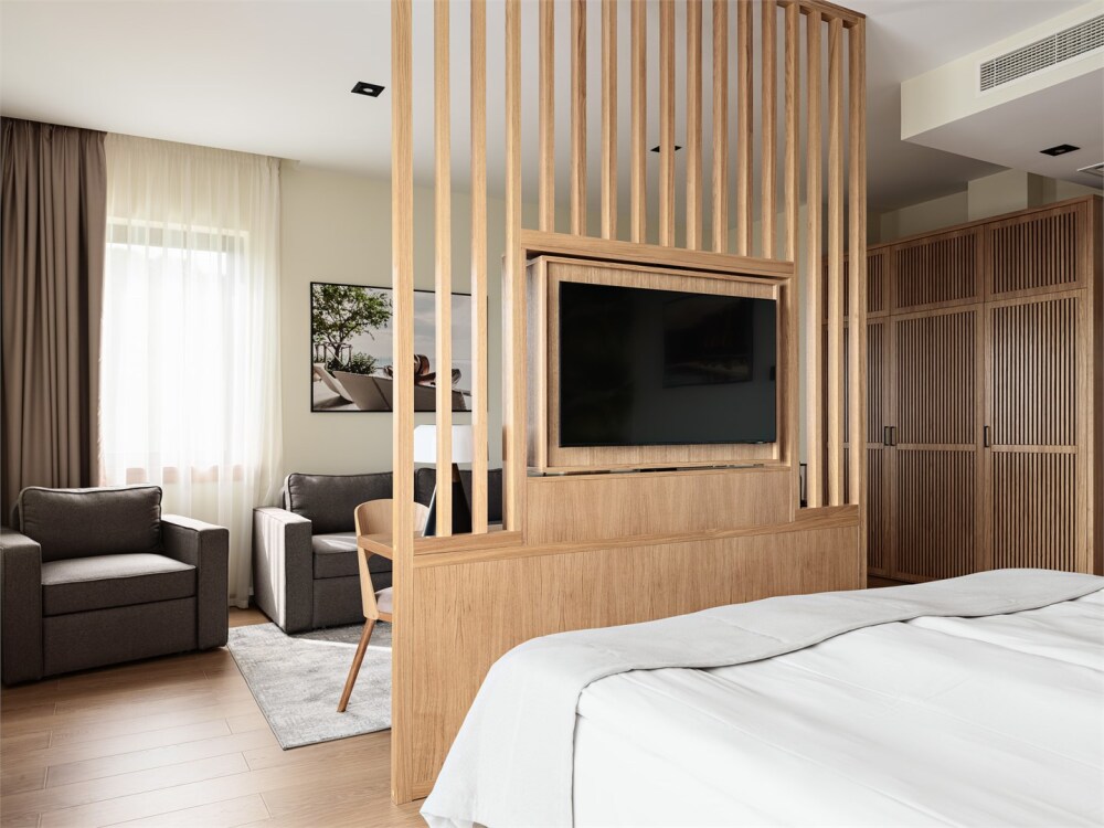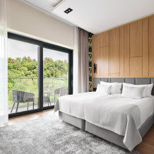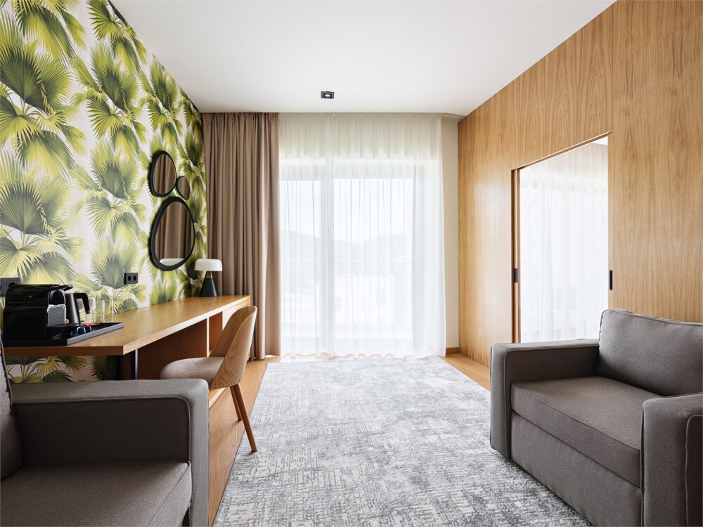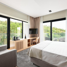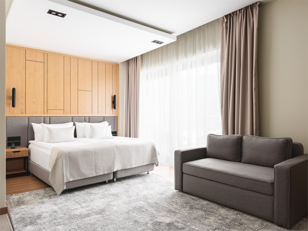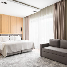 Номер повышенной комфортности с большой 2-спальной кроватью, двуспальным диваном и панорамным окном отлично подойдет для размещения, как индивидуальных гостей, так и семьи до 5 человек. Номер имеет зонирование, отделяющее спальную зону от зоны отдыха. Размещение пятого человека возможно на кресле-кровати. Один ребёнок до 4 лет — можно без отдельного спального места.