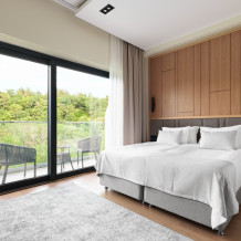 Просторный 4-местный номер с панорамным остеклением и балконом. Кровати трансформируется в одну 2-спальную или две 1-спальные кровати шириной 90 см. В качестве дополнительных мест предлагается двуспальный диван. Один ребёнок до 4 лет — можно без отдельного спального места.