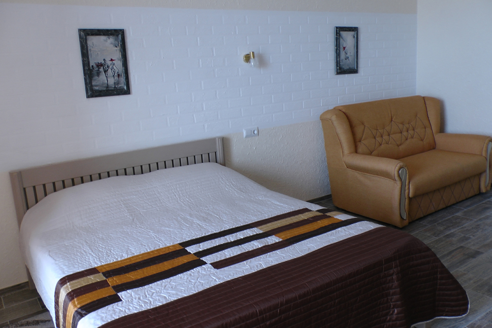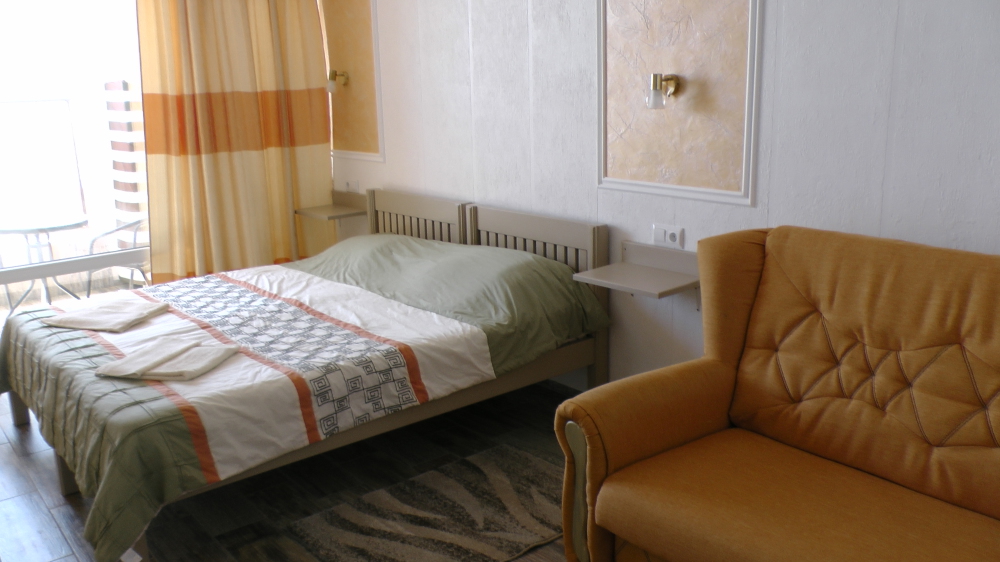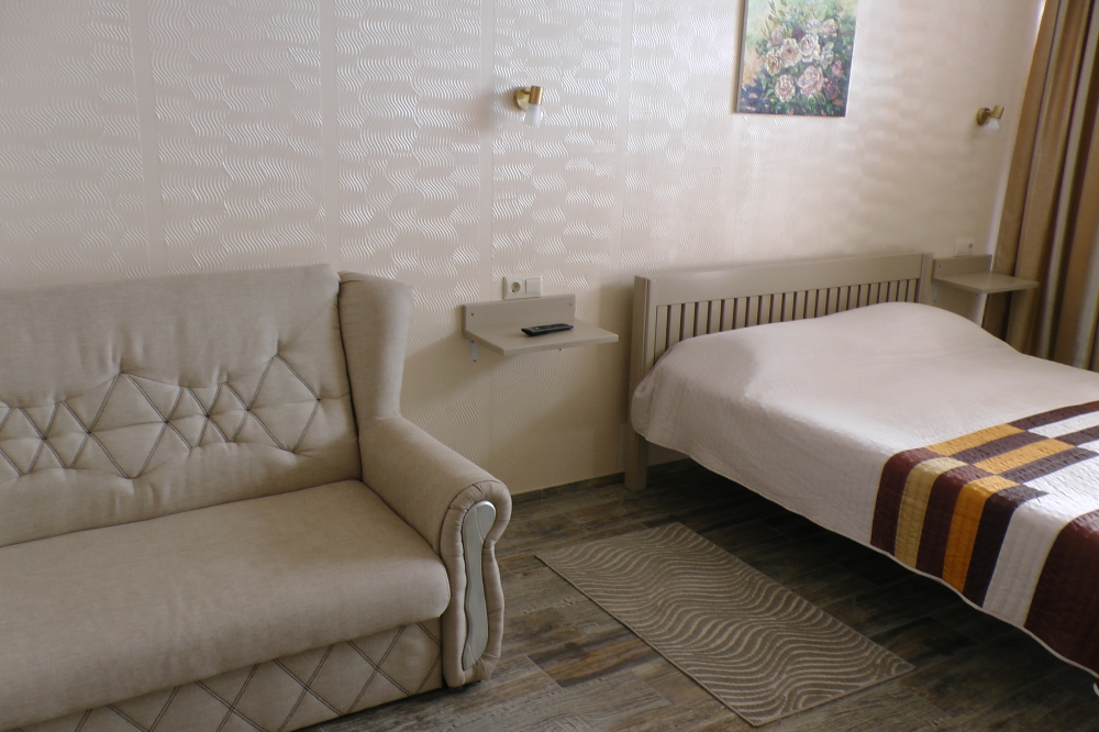 Встроенный шкаф, двух-спальная кровать и раскладной диван в каждом номере гостиницы.