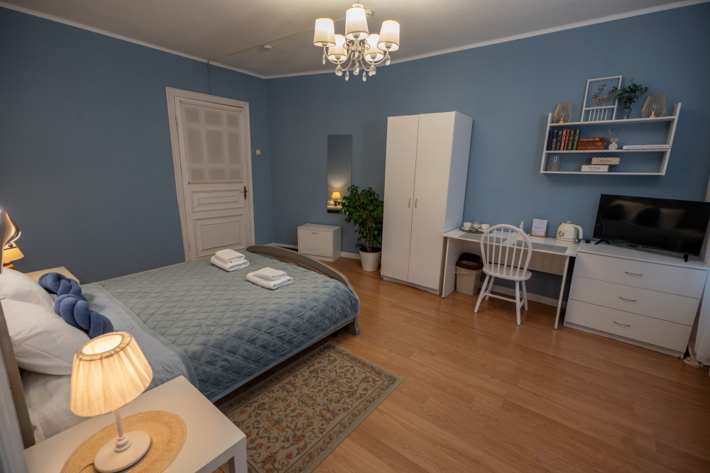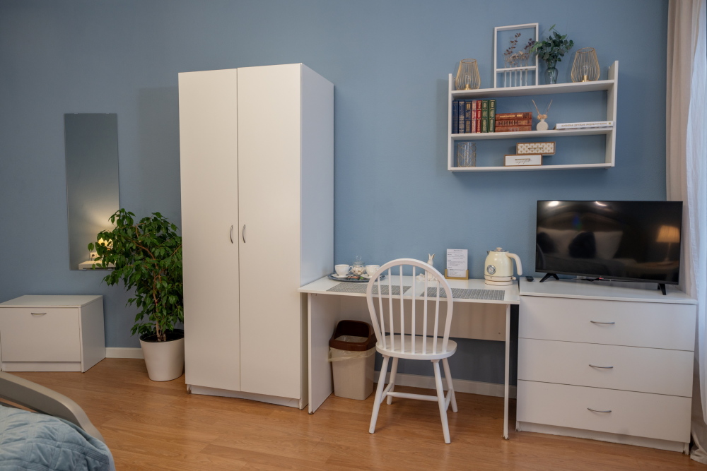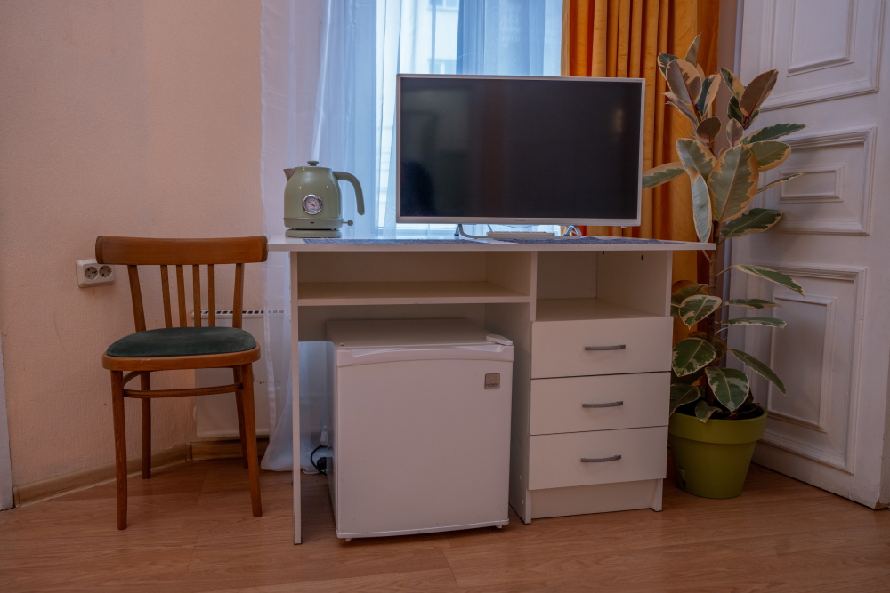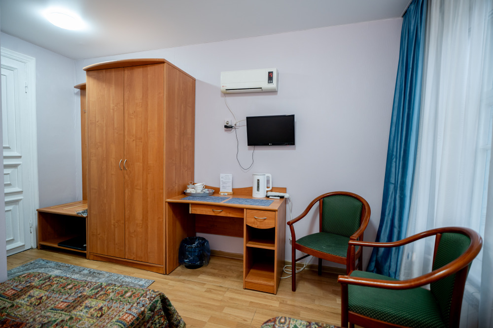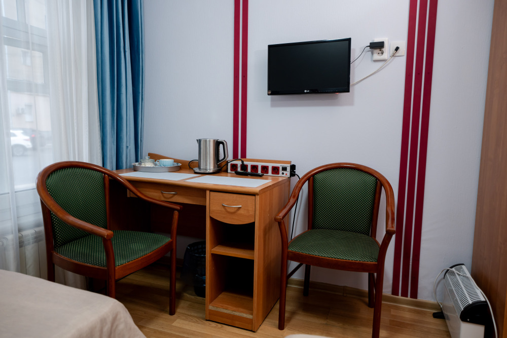 В номере есть всё для работы и отдыха: письменный стол, стул, шкаф, телевизор.