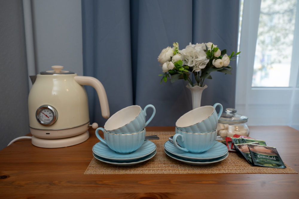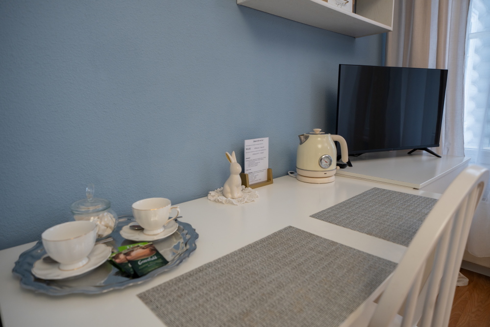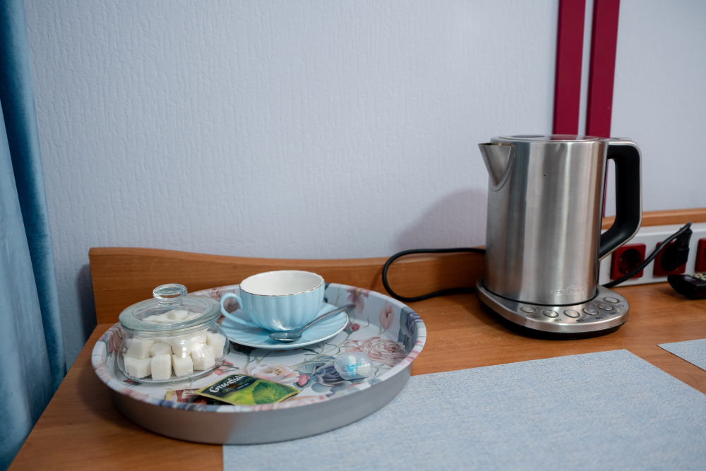 Чайная зона: электрический чайник, чай, сахар и чайная пара позволят в любой момент приготовить горячий напиток, не выходя из комнаты.