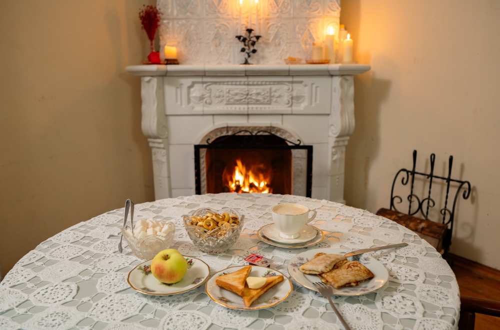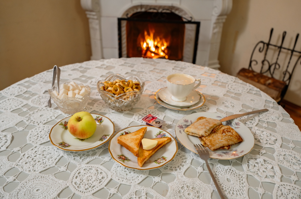 Для наших гостей доступен заказ завтрака, который подается в нашем уютном каминном зале, мы разжигаем камин, создавая неповторимую атмосферу для утренней трапезы.