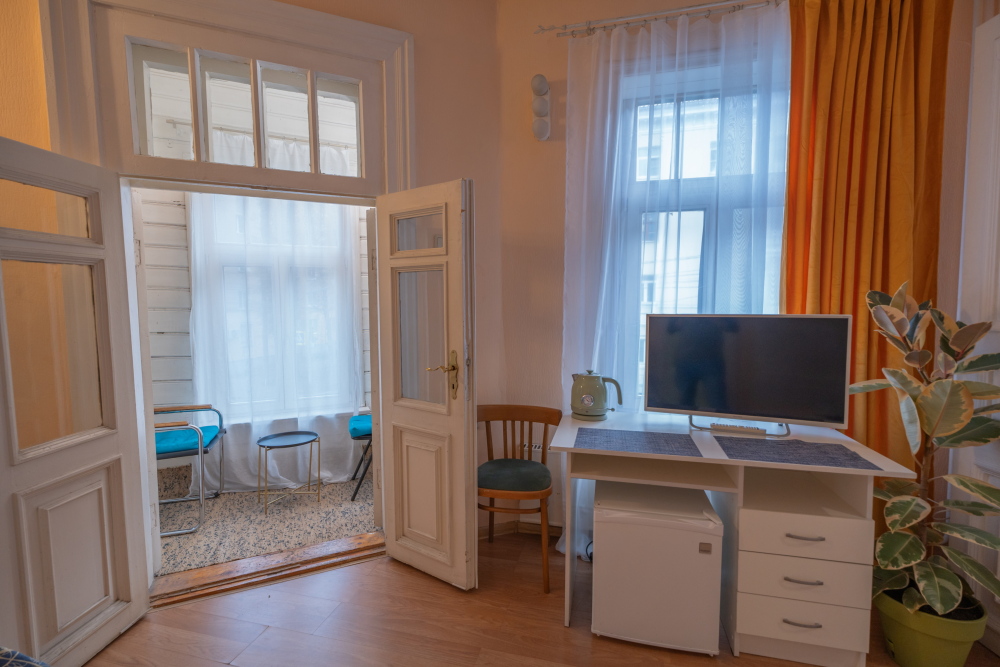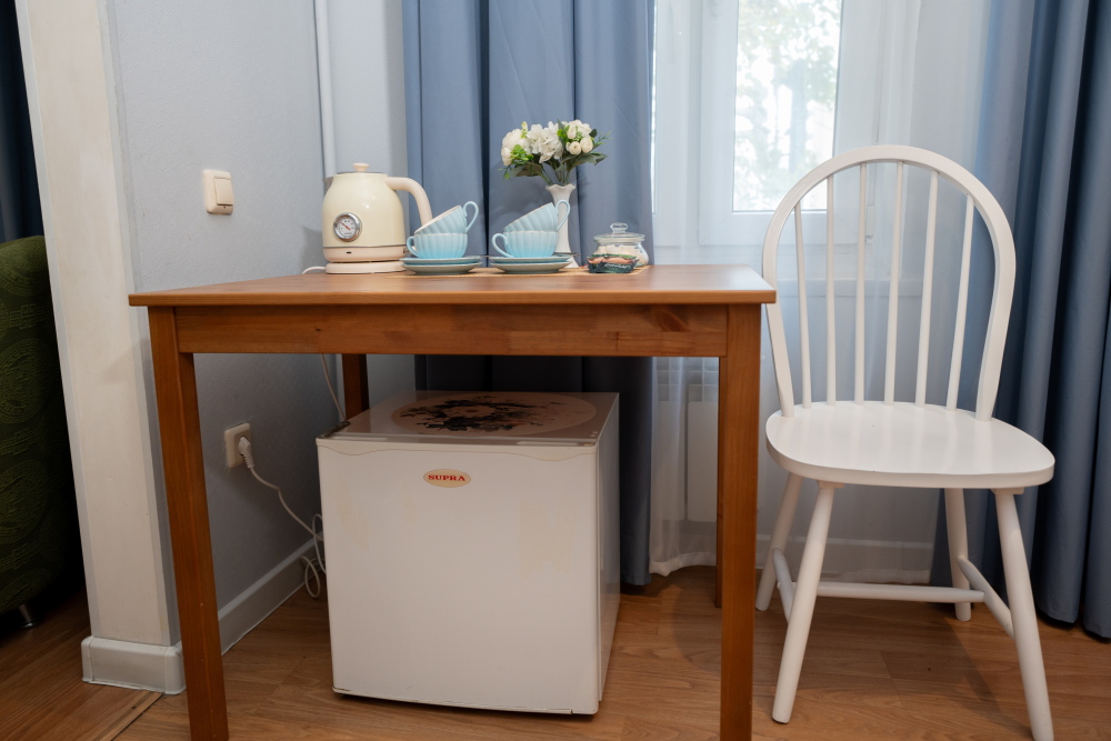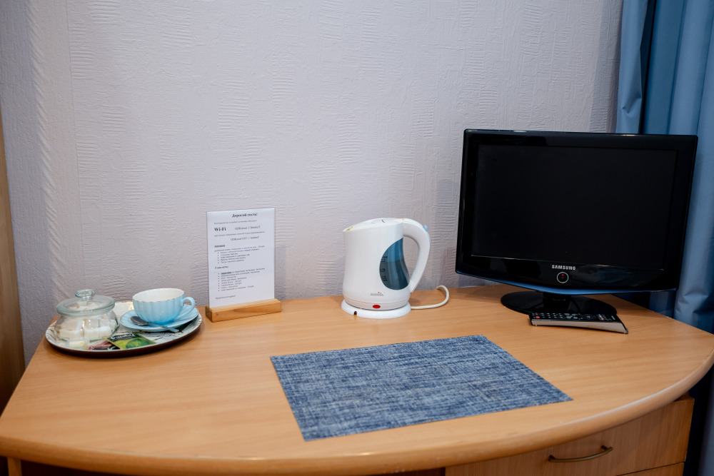 Всё необходимое под рукой: мы предусмотрели всё для Вашего удобства: платяной шкаф, письменный стол со стульями, телевизор, холодильник и электрический чайник с чайным набором (чай, сахар, чашки).